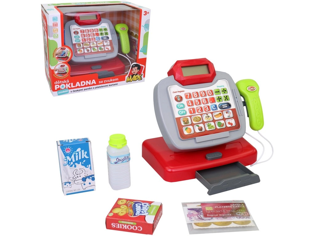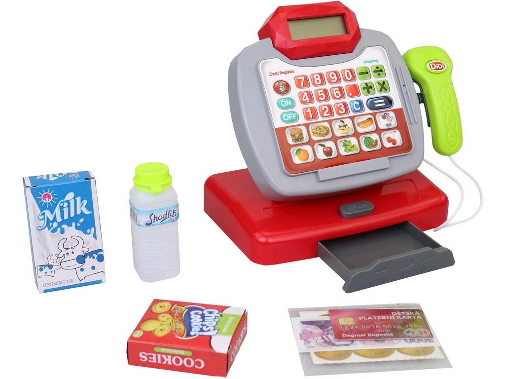 W zestawie znajdują się bogate akcesoria: czeskie banknoty, plastikowe monety o różnych nominałach oraz karty płatnicze. Dzieci w ten sposób ćwiczą liczenie i nawyki płatnicze w formie zabawy. Solidne plastikowe wykonanie zapewnia trwałość podczas codziennej zabawy.