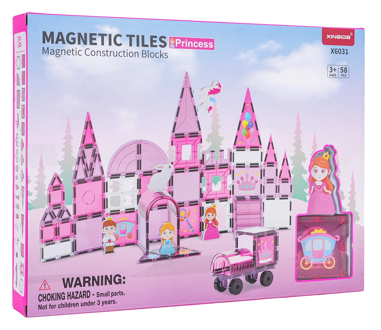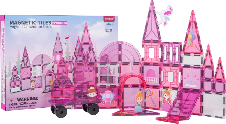 Odkryj czarodziejską magnetyczną klockownicę dla dzieci od 3 lat – zestaw 58 elementów do budowy różowego, księżniczkowego zamku. Elementy z wytrzymałego plastiku łączą się za pomocą silnych magnesów neodymowych, tworząc stabilne konstrukcje 3D. W zestawie znajdują się także figurki księcia, księżniczek, jednorożca i króliczka oraz podwozie z kółkami do pojazdów. Świetna zabawka, która rozwija kreatywność, cierpliwość i koncentrację.