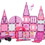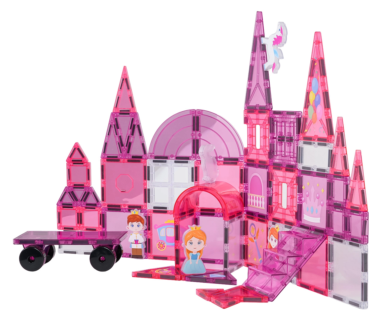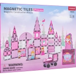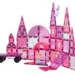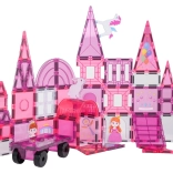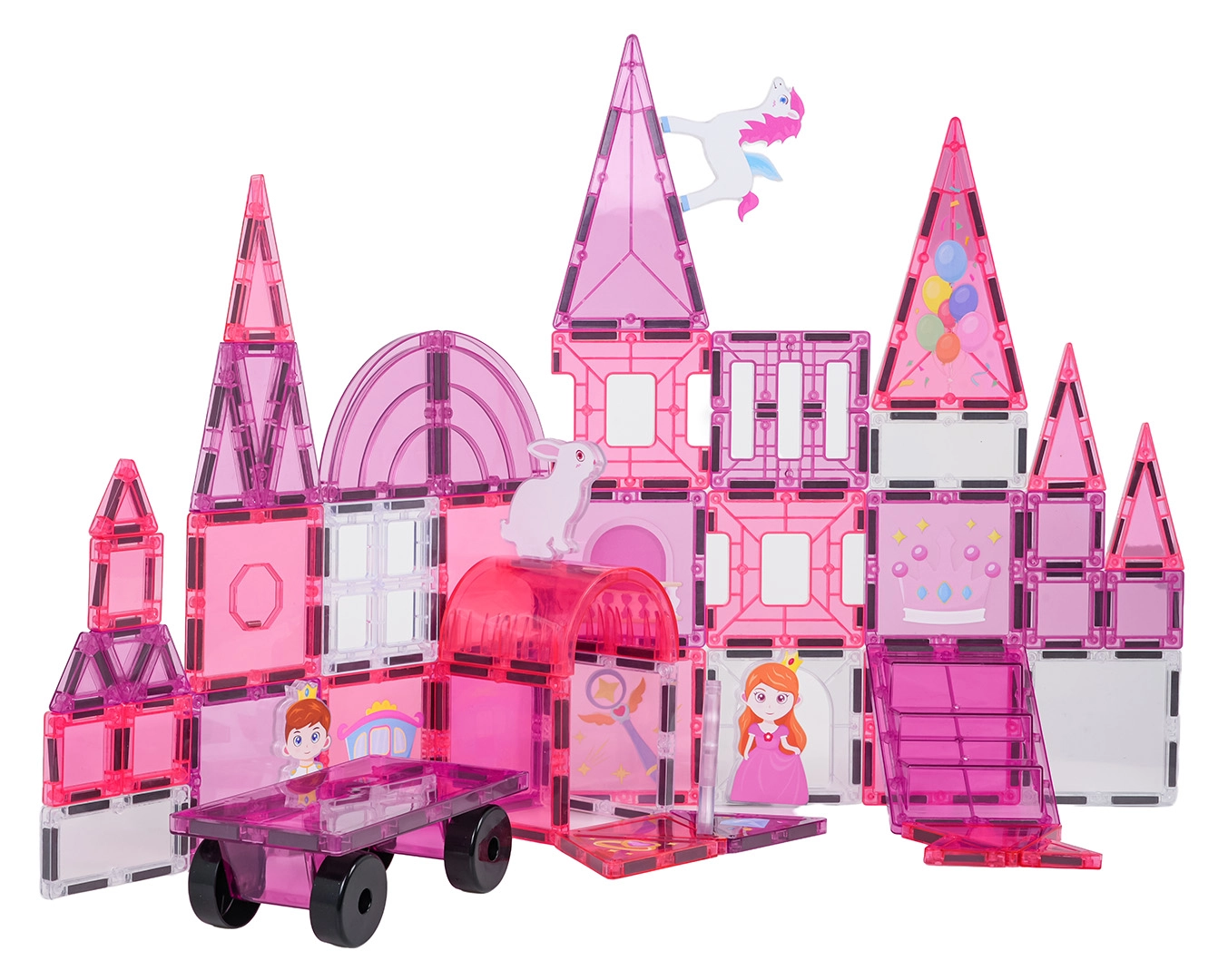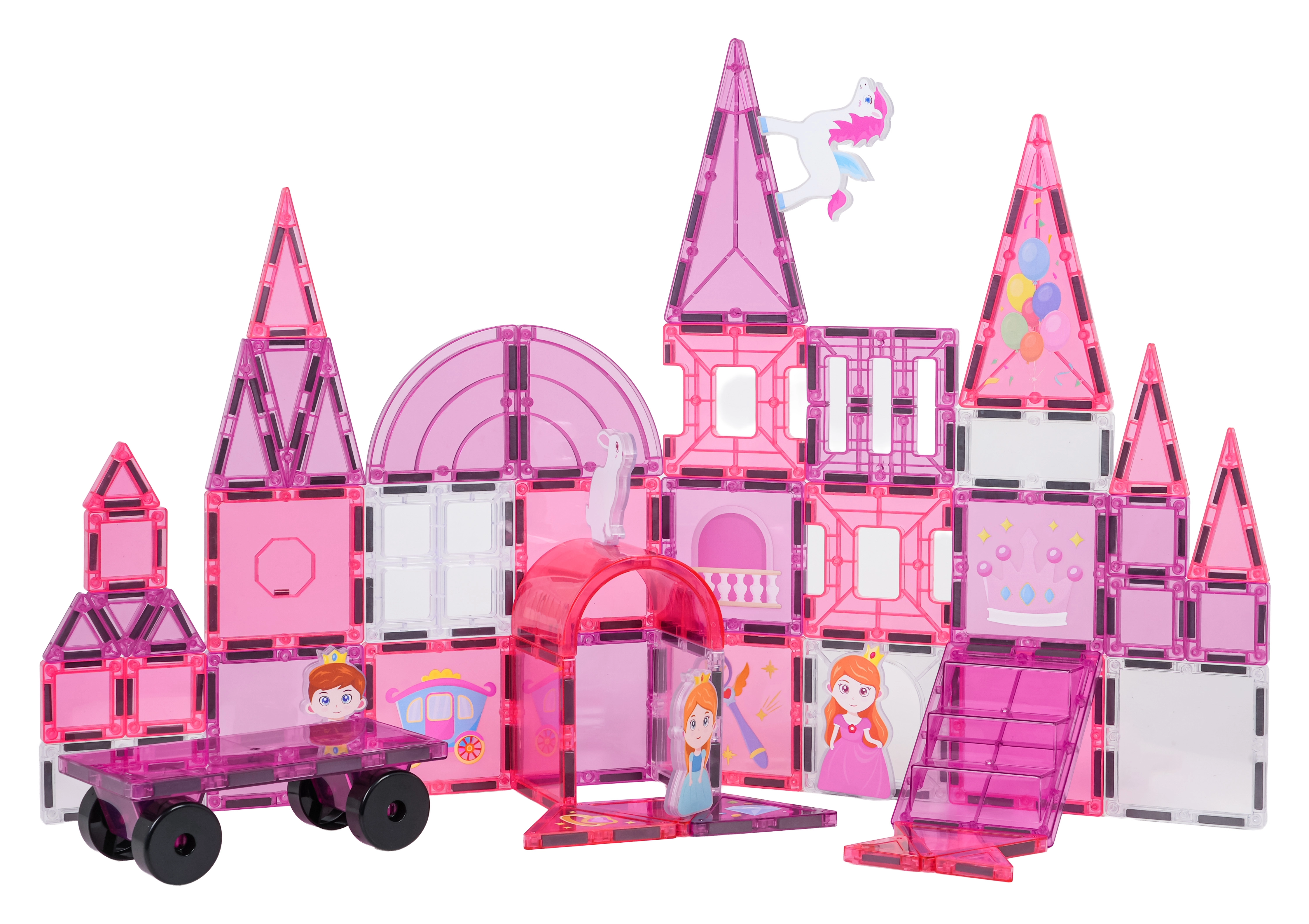 Magnetyczna klockownica Różowa księżniczka przenosi dzieci w świat fantazji i tworzenia. Przezroczyste, kolorowe elementy o różnych kształtach intuicyjnie się łączą, umożliwiając budowę wież, bram, okien, schodów oraz całych bajkowych zamków. Dzięki podwoziu z kółkami można tworzyć także karety lub wózki i włączać do zabawy dołączone figurki.