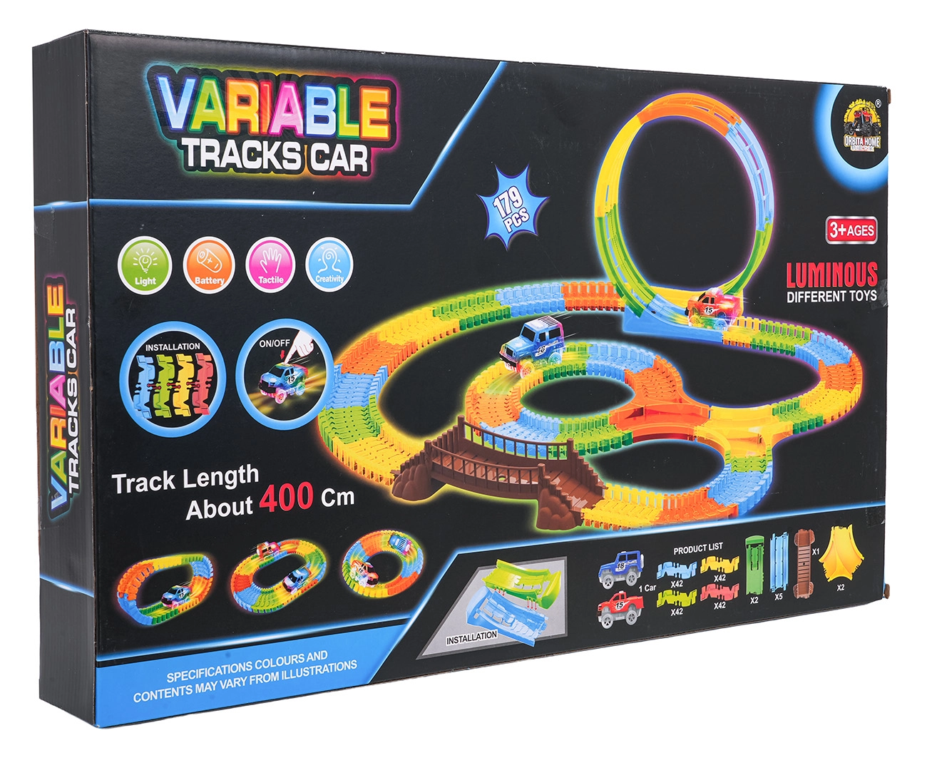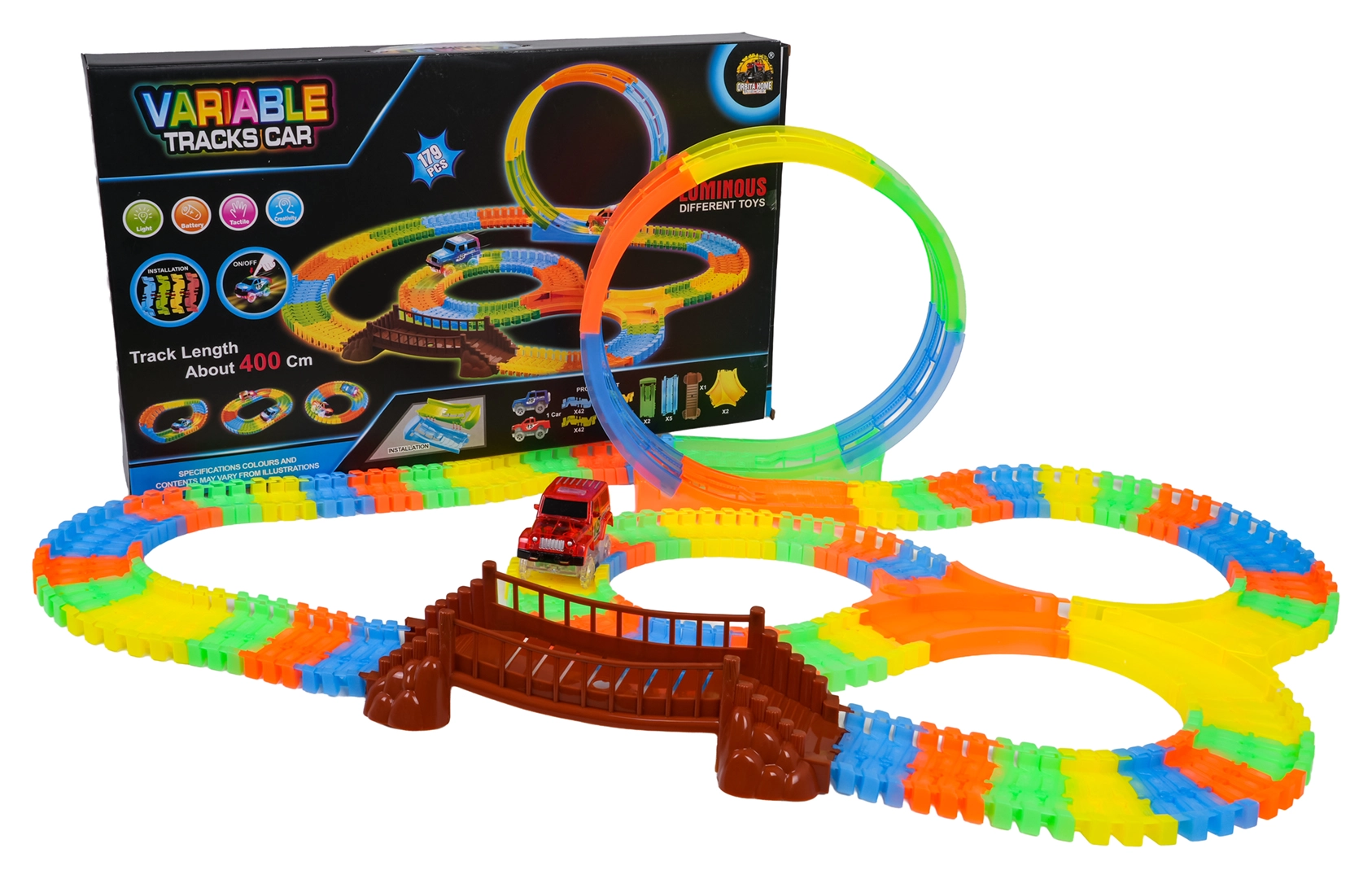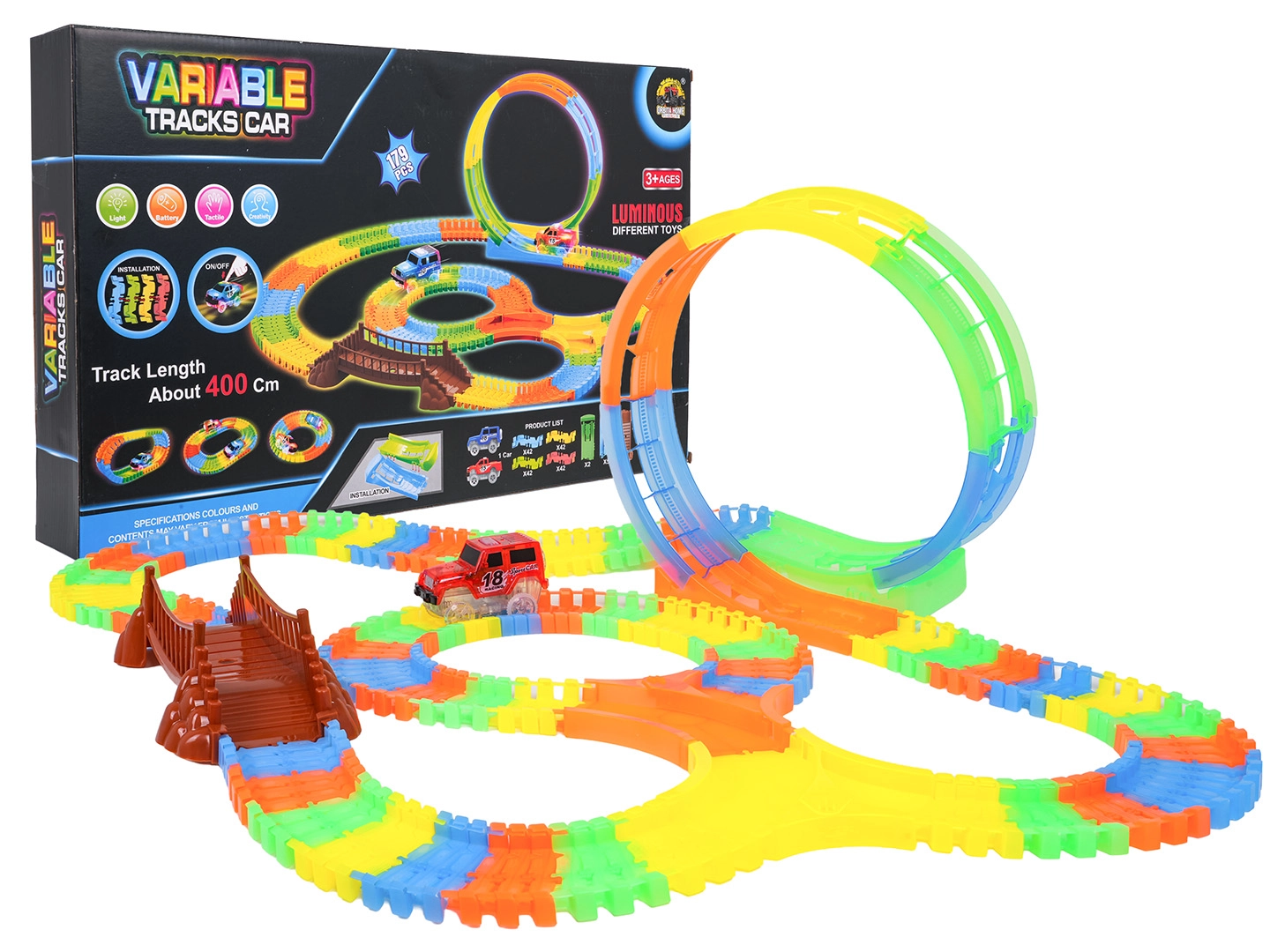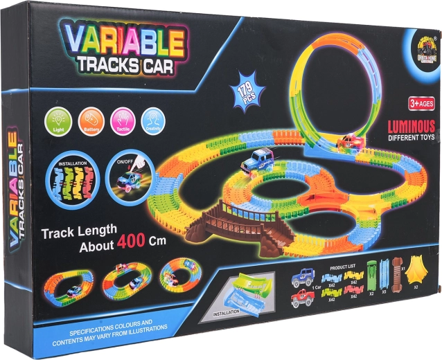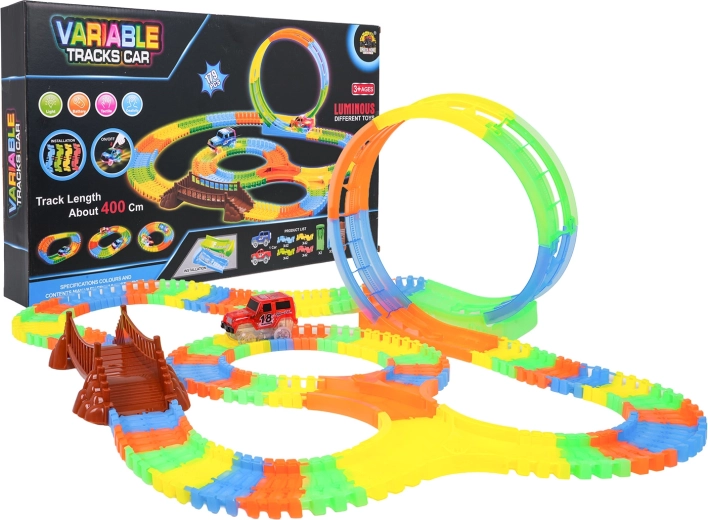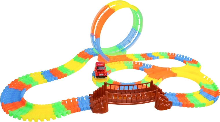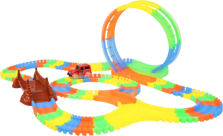 Ta kolorowa kolejka samochodowa ucieszy dzieci już od 3. roku życia. Dzięki elastycznym segmentom zbudujesz proste odcinki, zakręty, most oraz dużą pionową pętlę – i to w kilka chwil. Fluorescencyjne wykonanie zapewnia efekt świecenia w ciemności, a autko LED mknie po torze, zostawiając świetlny ślad.