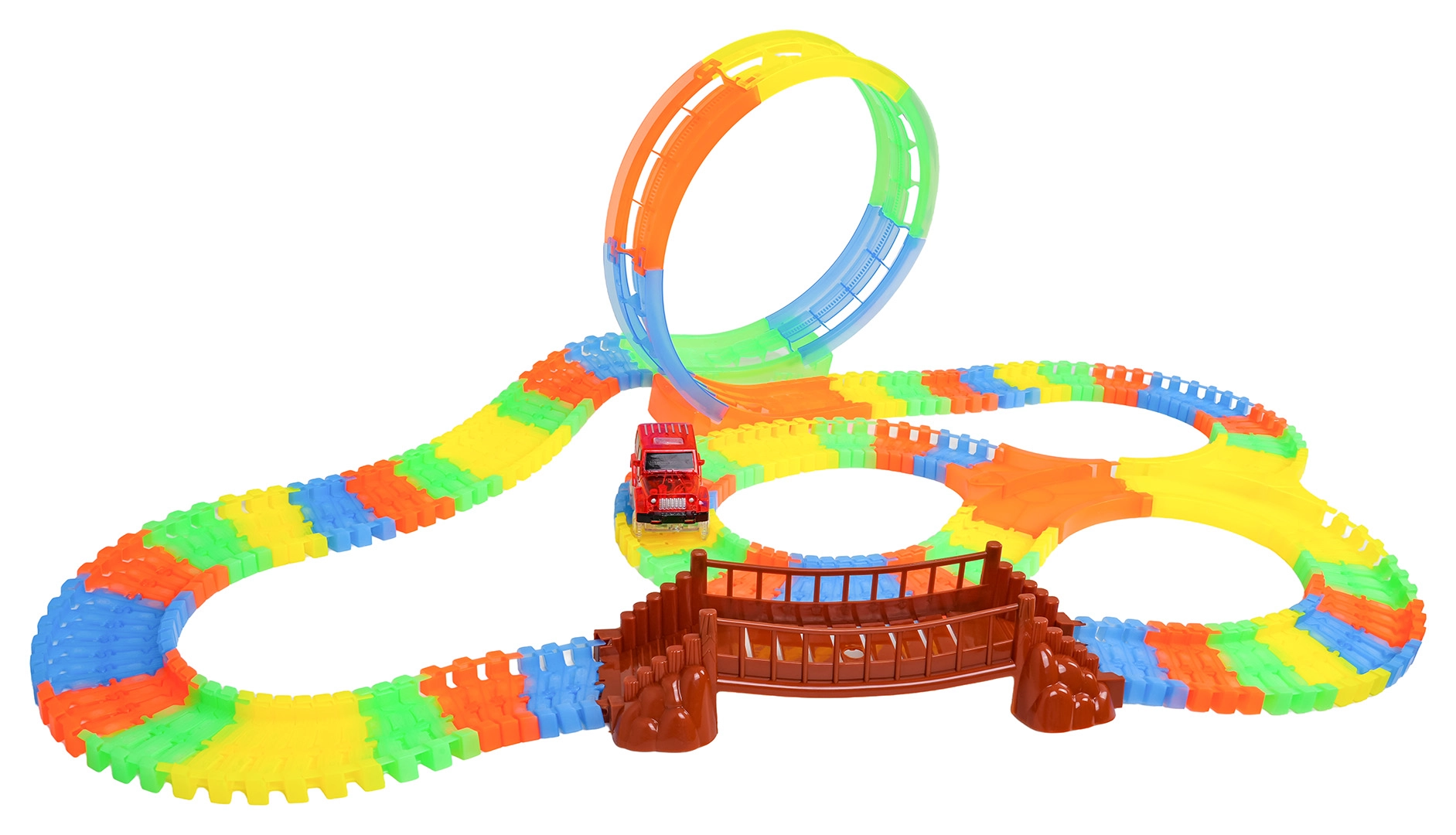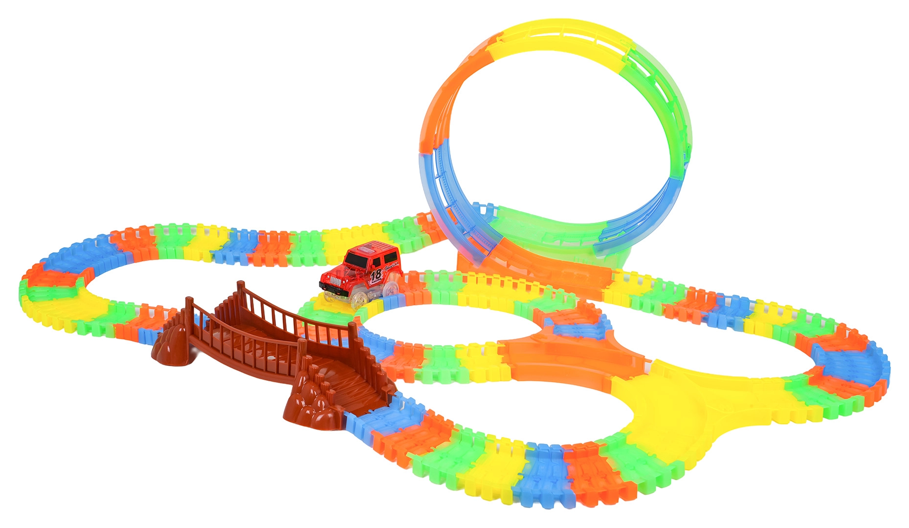Giętkie segmenty łatwo się zatrzaskują, wyginają, unoszą i przebudowują – twórz mosty, zakręty oraz pionową pętlę dokładnie według wyobraźni.