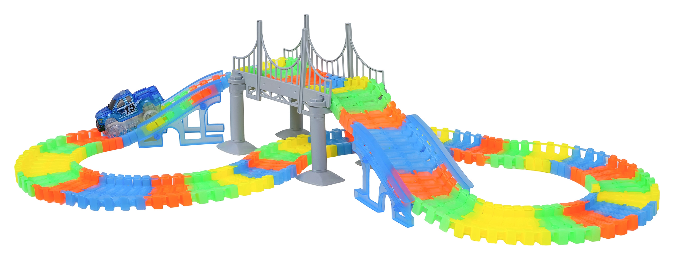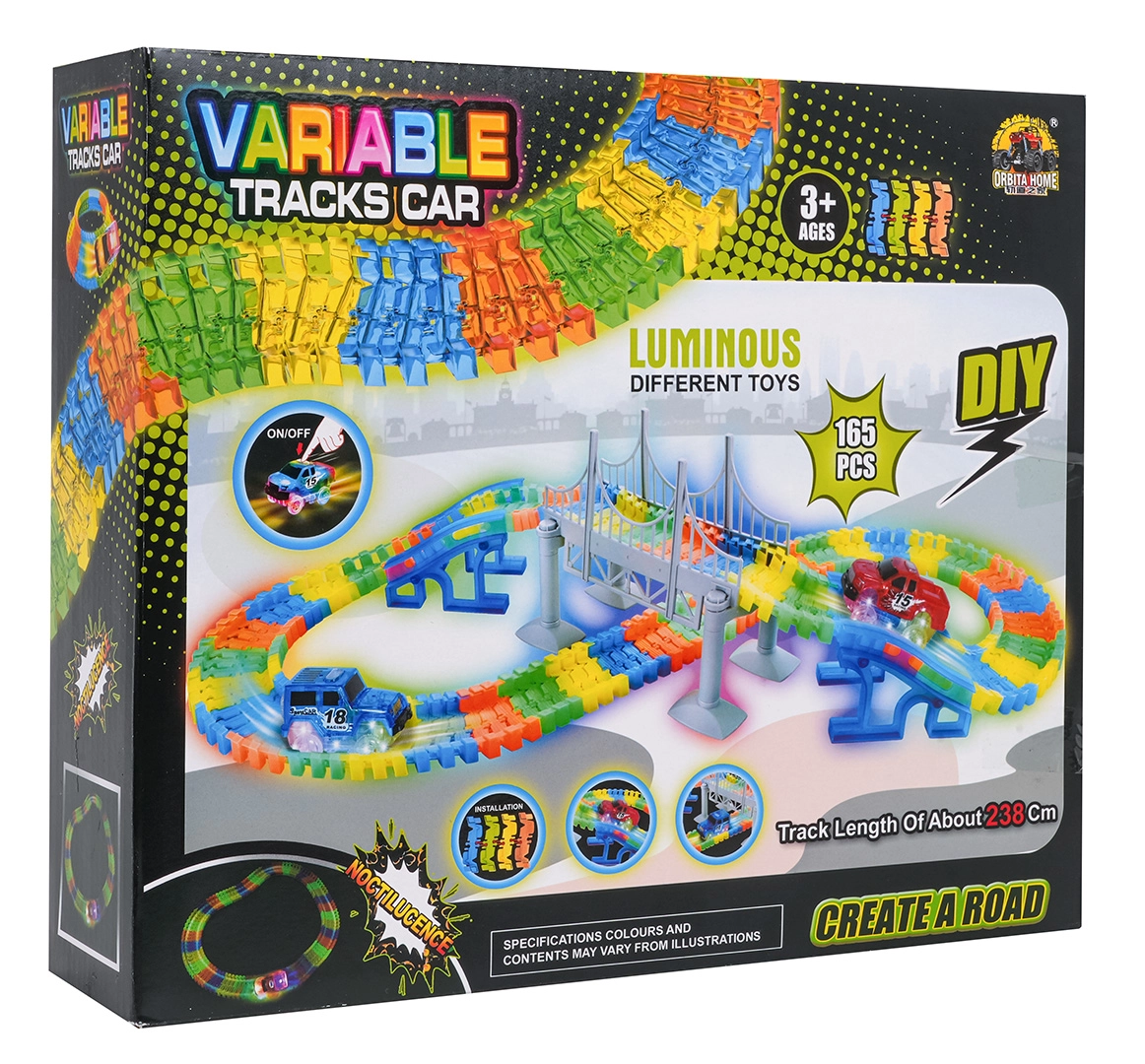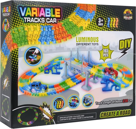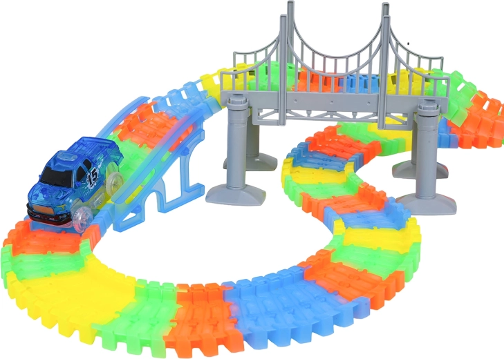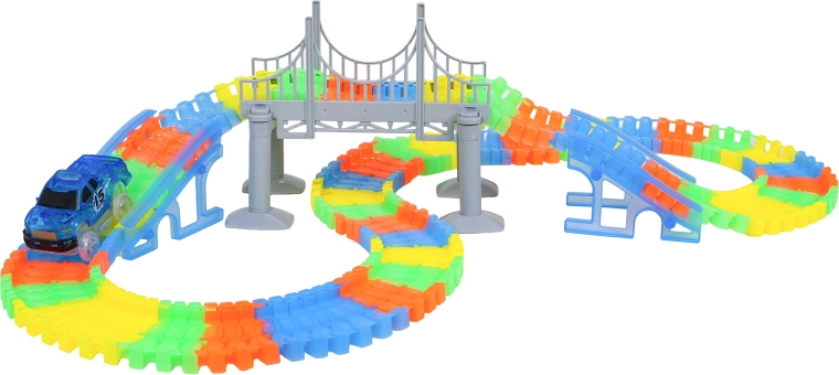 Ten kreatywny tor wyścigowy oferuje dzieciom od 3 lat godziny pomysłowej zabawy. Elementy łatwo się zatrzaskują, tor jest giętki i obrotowy, więc można tworzyć mosty, rampy i odważne zakręty. Fluorescencyjne wykonanie szyn rozświetli pokój po zgaszeniu światła.