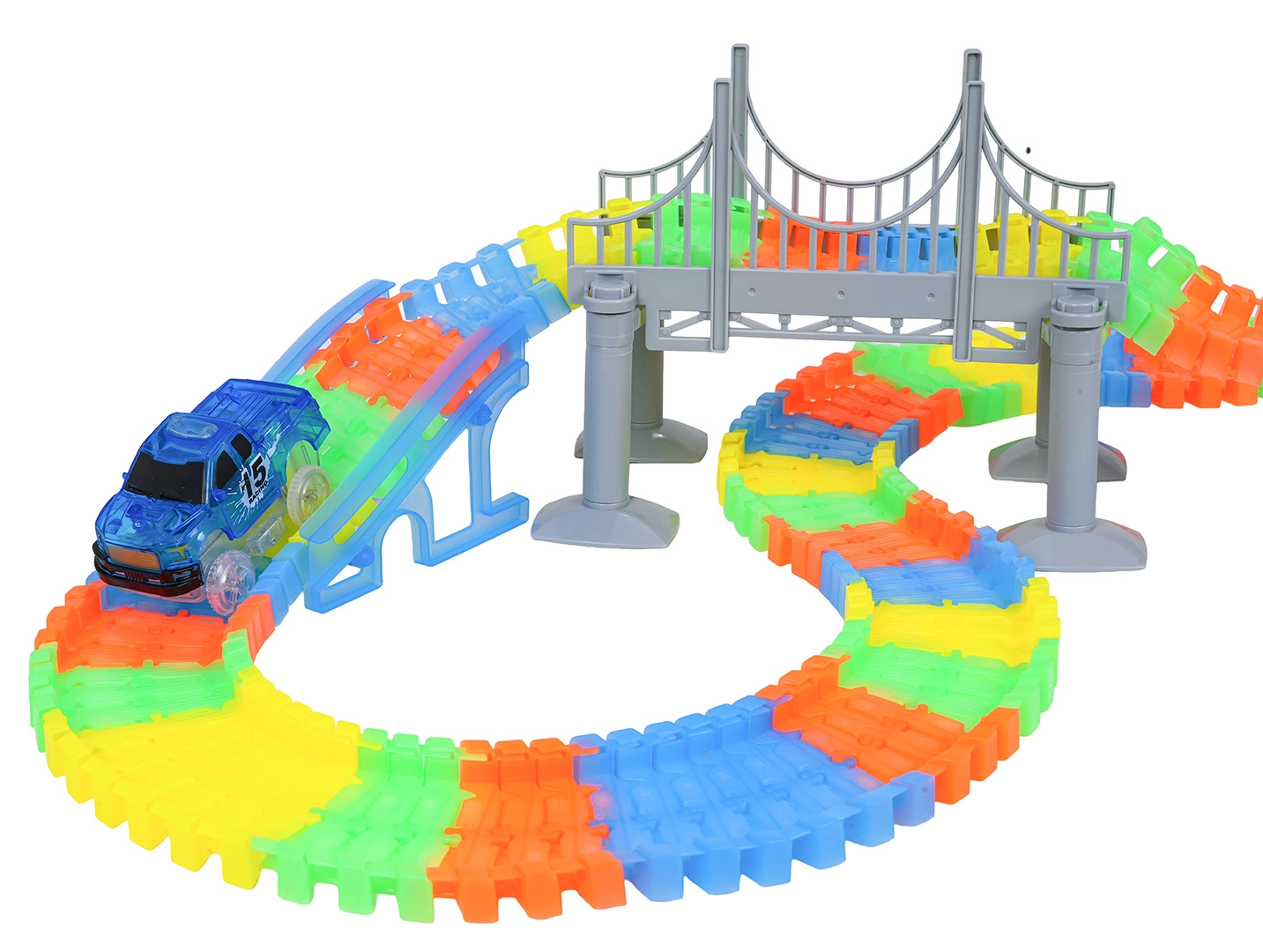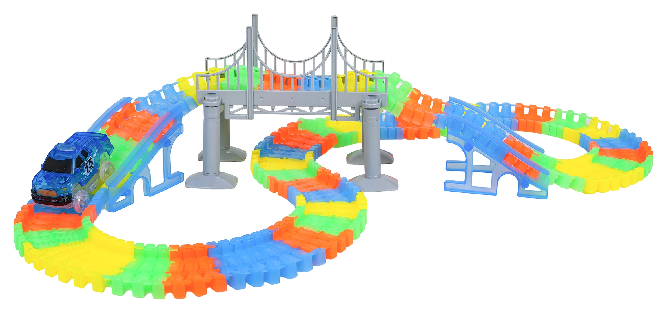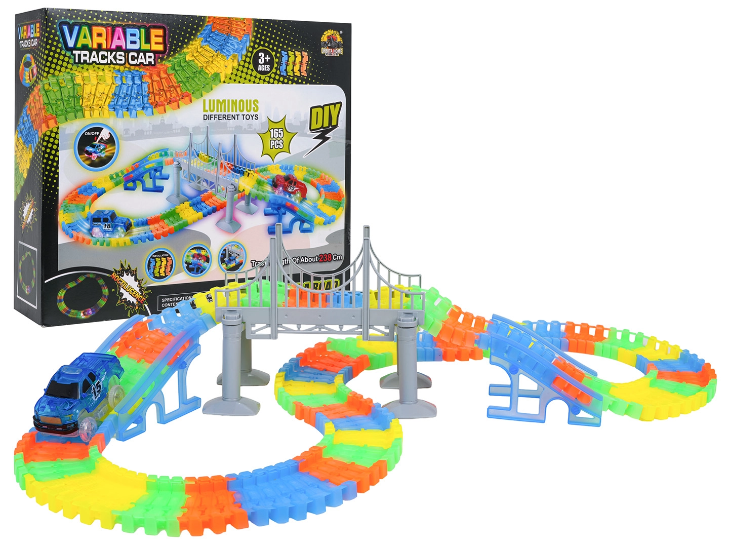Ten kreatywny tor wyścigowy oferuje dzieciom od 3 lat godziny pomysłowej zabawy. Elementy łatwo się zatrzaskują, tor jest giętki i obrotowy, więc można tworzyć mosty, rampy i odważne zakręty. Fluorescencyjne wykonanie szyn rozświetli pokój po zgaszeniu światła.