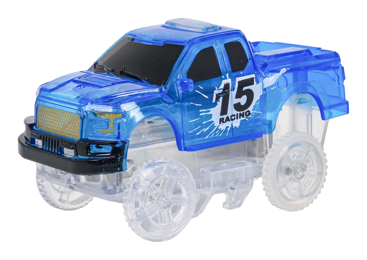 Przezroczysty wyścigowy samochodzik z diodami LED ożywia tor. Wystarczy nacisnąć przycisk na dachu. Zasilanie 2× AA (brak w zestawie).