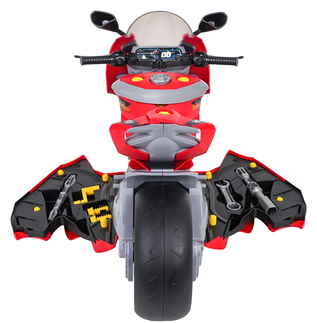 Ta sprytnie zaprojektowana zabawka łączy motocykl do wyobrażeniowej jazdy oraz warsztat mechaniczny dla małych majsterkowiczów. Po otwarciu paneli bocznych odsłaniają się świecące tłoki silnika, które można wyjąć i badać. Dzieci uczą się podstawowych zasad działania maszyny w formie zabawy, jednocześnie rozwijając motorykę małą i zręczność.
