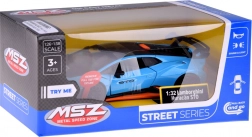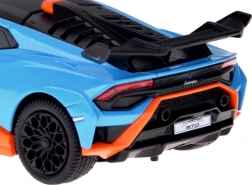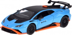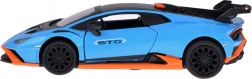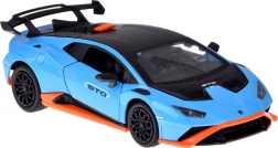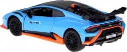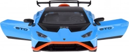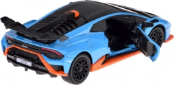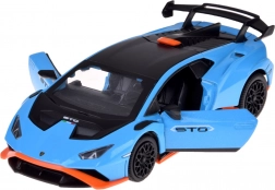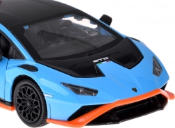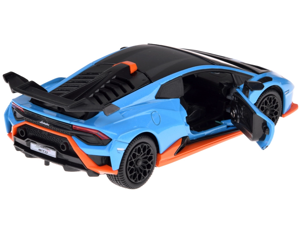 Ten dopracowany w detalach model LAMBORGHINI Huracán STO w skali 1:32 ucieszy dzieci i dorosłych fanów supersamochodów. Metalowe nadwozie w niebieskim metaliku z czarnymi i pomarańczowymi akcentami, wierne linie oraz duże tylne skrzydło podkreślają autentyczny wygląd. Otwarcie drzwi aktywuje efekty świetlne i dźwiękowe – zapalają się światła i słychać odgłos silnika oraz klakson.
