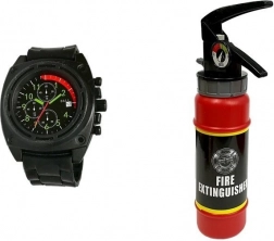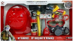 W zestawie znajdziesz kask, maskę, końcówkę węża, siekierkę, łom, ręczny gaśniczy aparat (gaśnicę), krótkofalówkę i zegarek. Zestaw dostarczany jest w prezentowym opakowaniu z okienkiem, dzięki czemu to świetny pomysł na prezent dla małych miłośników straży pożarnej.