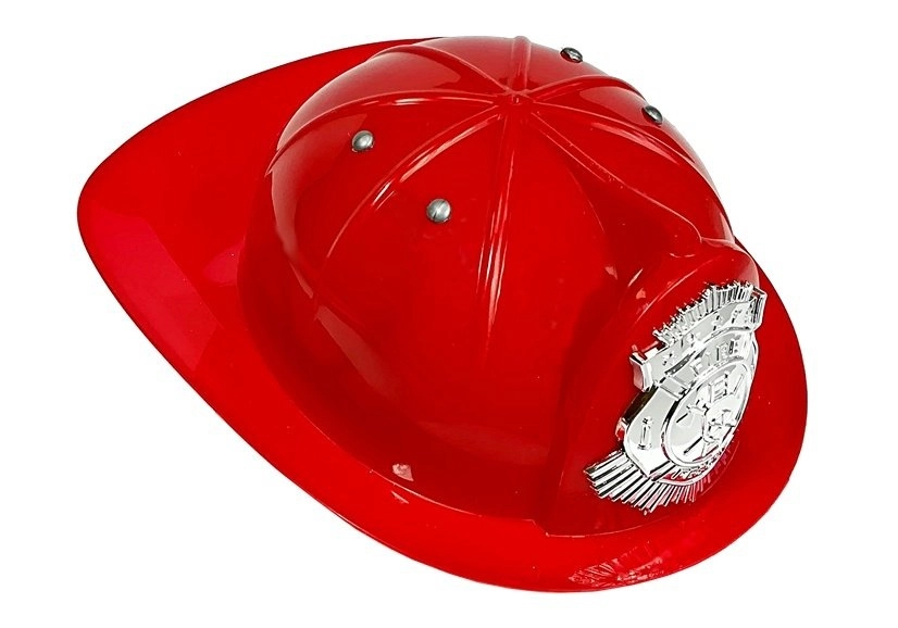 Czerwony dziecięcy kask z nitami wentylacyjnymi i emblematem zapewnia wygodne noszenie i świetnie uzupełnia strażacki kostium.