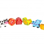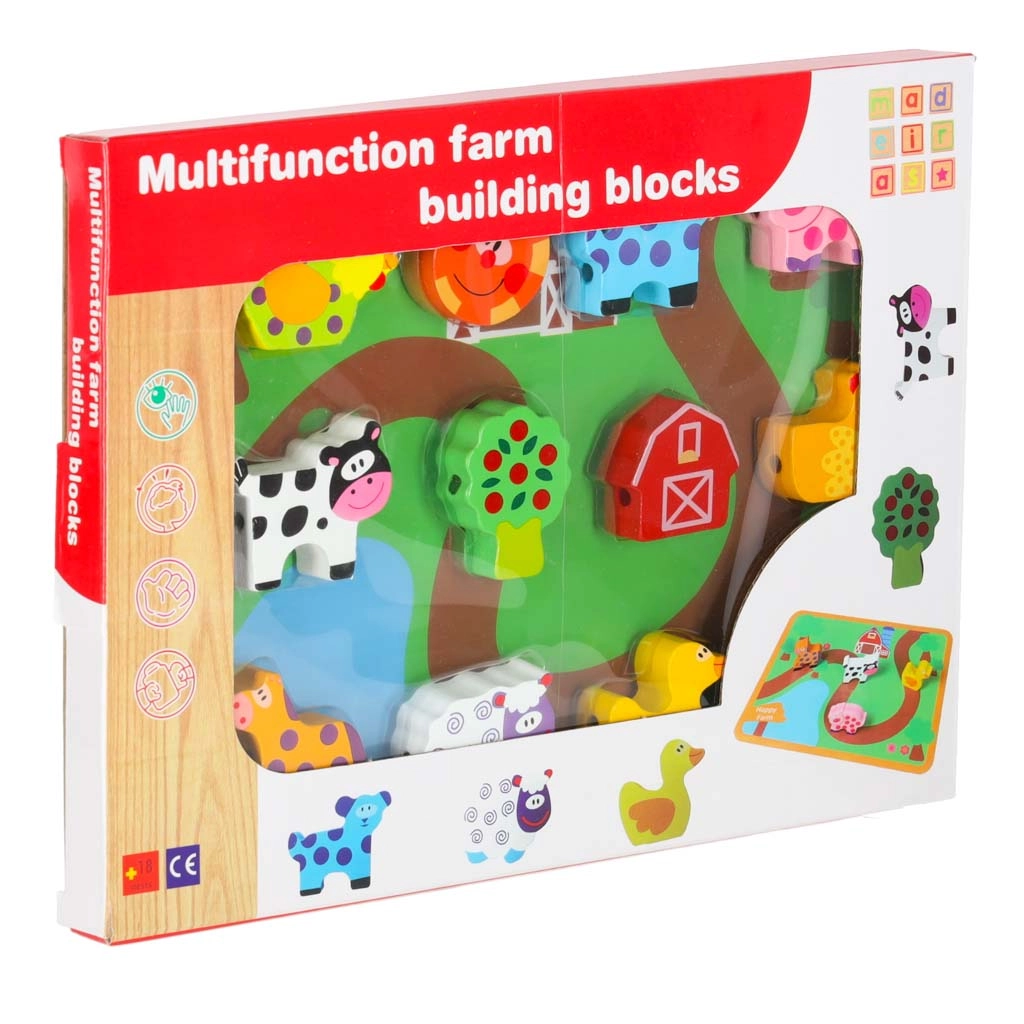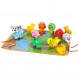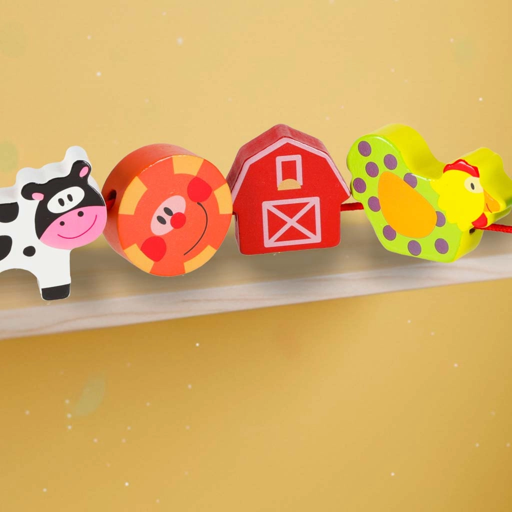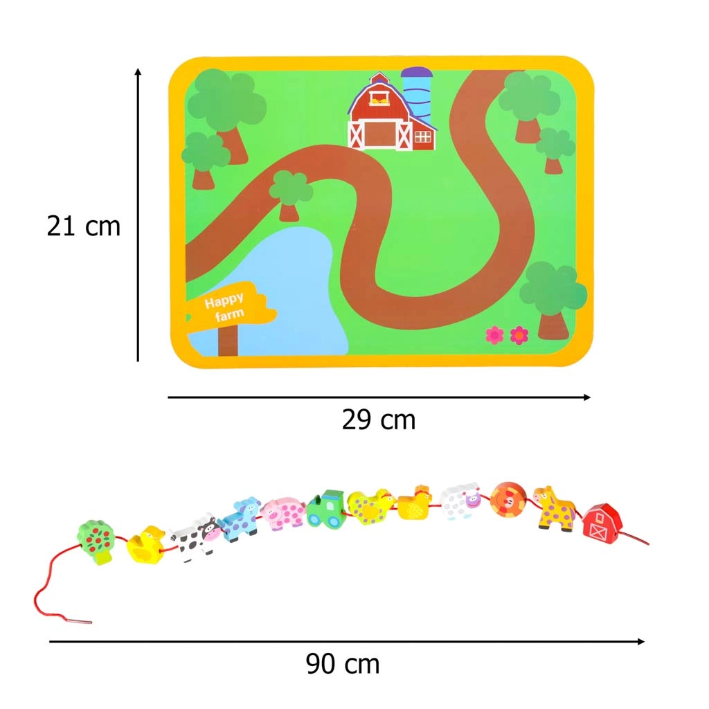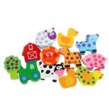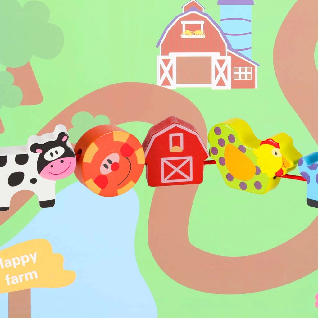 Ten kolorowy drewniany zestaw z motywami farmy łączy zabawę i naukę. Dzieci mogą nawlekać zwierzątka, stodołę, traktor i inne elementy na sznurek, układać scenki na dołączonej planszy i rozwijać motorykę, myślenie logiczne oraz wyobraźnię. Gładko wykończone, solidne elementy świetnie leżą w dziecięcej dłoni.