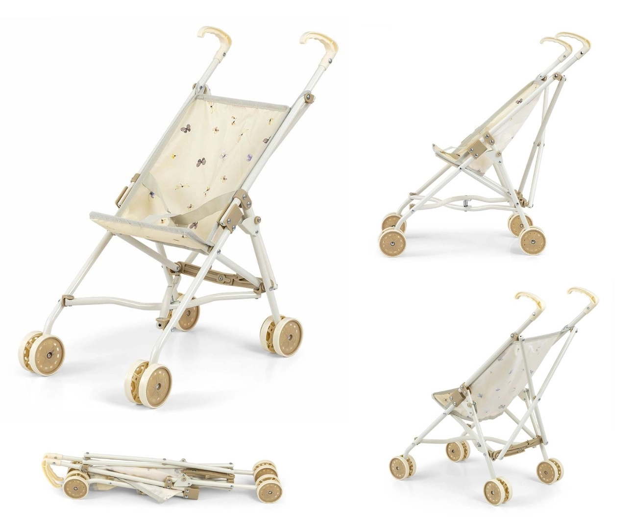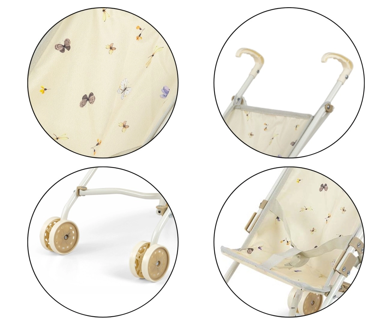 Dzięki szybkiemu składaniu parasolkowemu wózek łatwo złożyć na płasko, więc nie zajmuje miejsca w domu ani w podróży. Metalowy stelaż zapewnia solidność, podwójne kółka płynną jazdę, a pas bezpieczeństwa utrzymuje lalkę pewnie na miejscu.