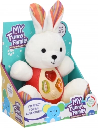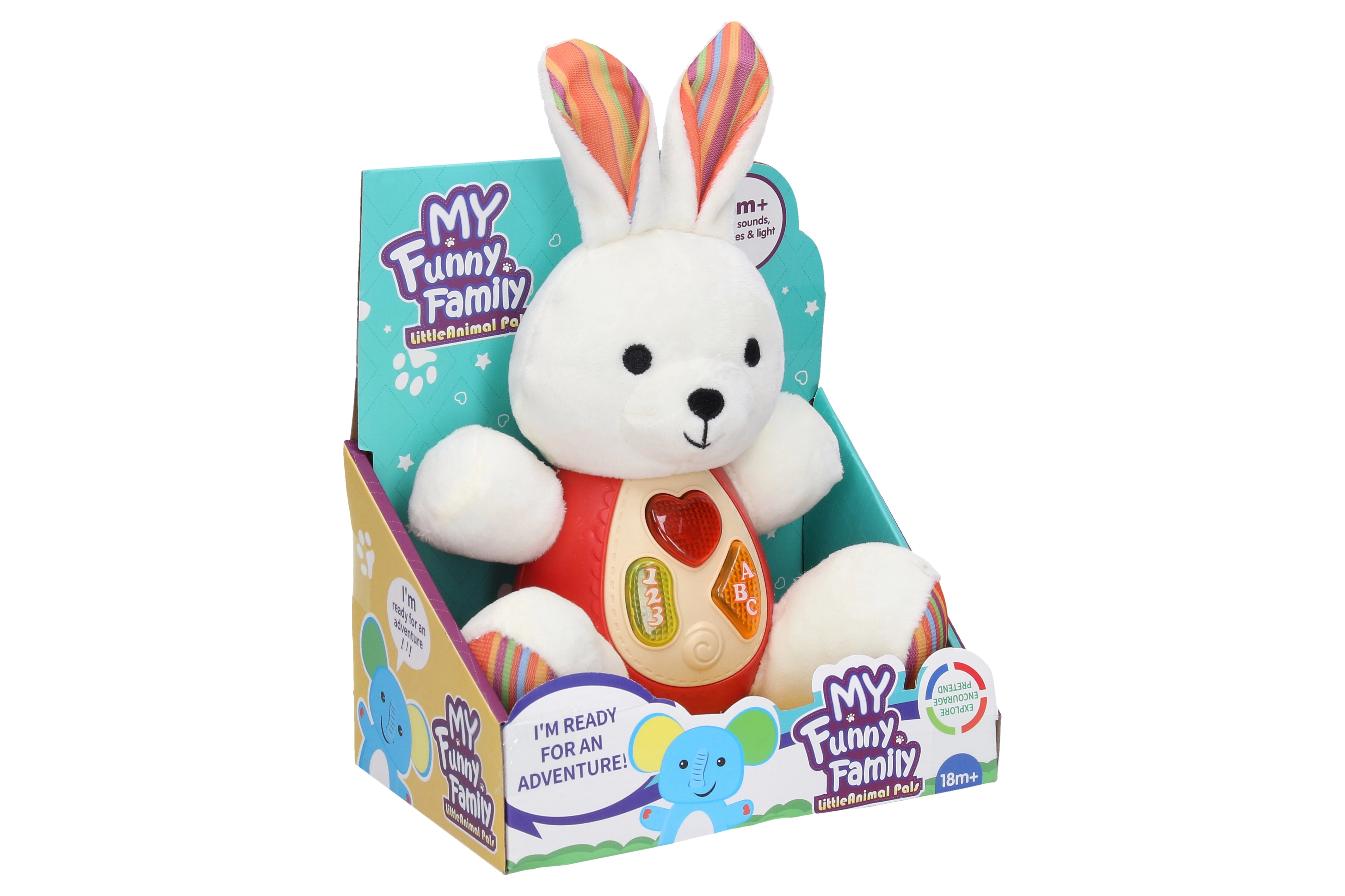 Ten mięciutki interaktywny króliczek to świetny towarzysz pierwszych odkryć dźwięków i świateł. Łączy przyjemną pluszową powierzchnię z wytrzymałym plastikowym brzuszkiem, na którym dzieci łatwo aktywują melodie, dźwięki i efekty świetlne. Dzięki kompaktowym wymiarom wygodnie leży w dłoni i jest idealny do zabawy w domu i w podróży.