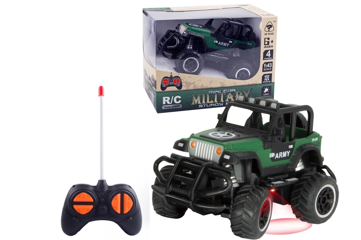 Kompaktowy terenowy wojskowy samochód RC w skali 1:43 ucieszy każdego małego kierowcę. Oferuje łatwe sterowanie, wytrzymałą konstrukcję i zabawę w domu i na zewnątrz. Zasilanie na 4× baterie AA (nie są dołączone do zestawu). Odpowiedni dla dzieci od 6 lat.