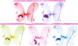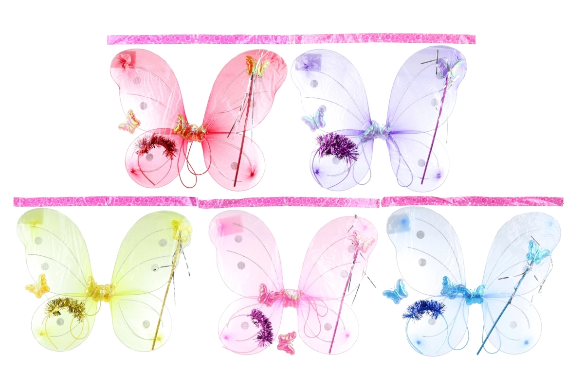 Zmień małą wróżkę w królową karnawału. Błyszczące motyle skrzydła z opaską i różdżką wnoszą mnóstwo zabawy i magicznej atmosfery na każde przyjęcie. Dzięki lekkim materiałom są wygodne w noszeniu i łatwe do założenia.