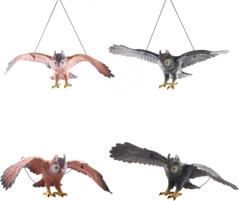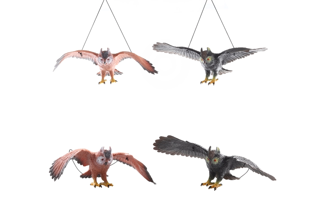 Realistyczna plastikowa sowa o długości 38 cm z łatwym zawieszeniem na gumce. Dzięki szczegółowemu wykonaniu, dwóm kolorom i możliwości symulacji lotu jest dekoracją i zabawką dla dzieci od 3 lat. Wnętrzach i na zewnątrz służy jako stylowy dodatek i może posłużyć także jako odstraszacz ptaków.