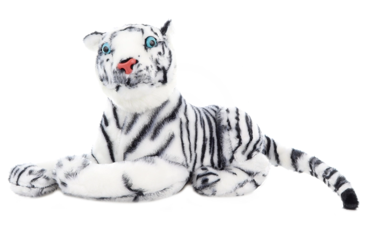 Uroczy i miękki towarzysz dla dzieci od urodzenia – pluszowy biały tygr o długości 57 cm. Delikatny materiał, bezpieczny dla najmłodszych, idealny do przytulania oraz jako dekoracja do pokoju dziecięcego.