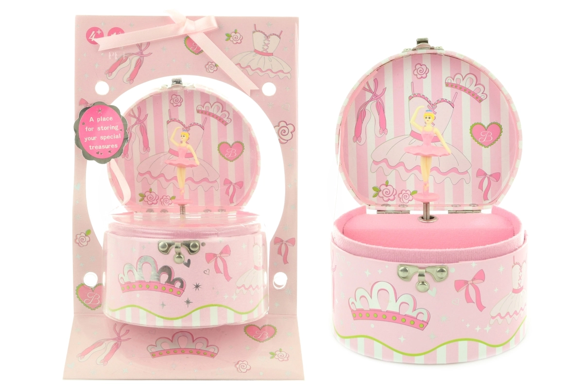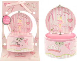 Ta elegancka pozytywka–szkatułka z baletnicą oferuje idealne miejsce na pierścionki, bransoletki i inne drobiazgi. Po otwarciu wieczka i nakręceniu kluczyka baletnica zaczyna z gracją tańczyć przed lusterkiem, a rozlega się przyjemna muzyka. Dzięki kompaktowym wymiarom szkatułka bez trudu zmieści się na szafce nocnej lub półce w pokoju dziecięcym.