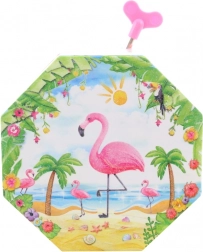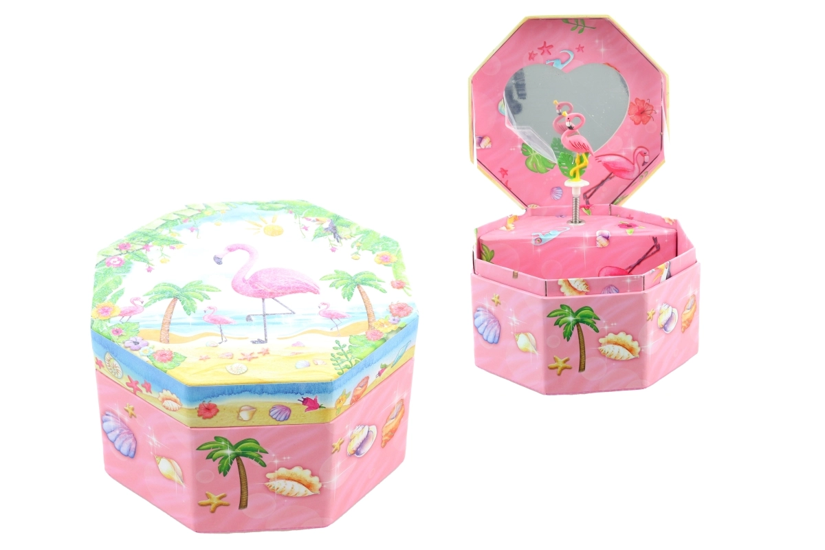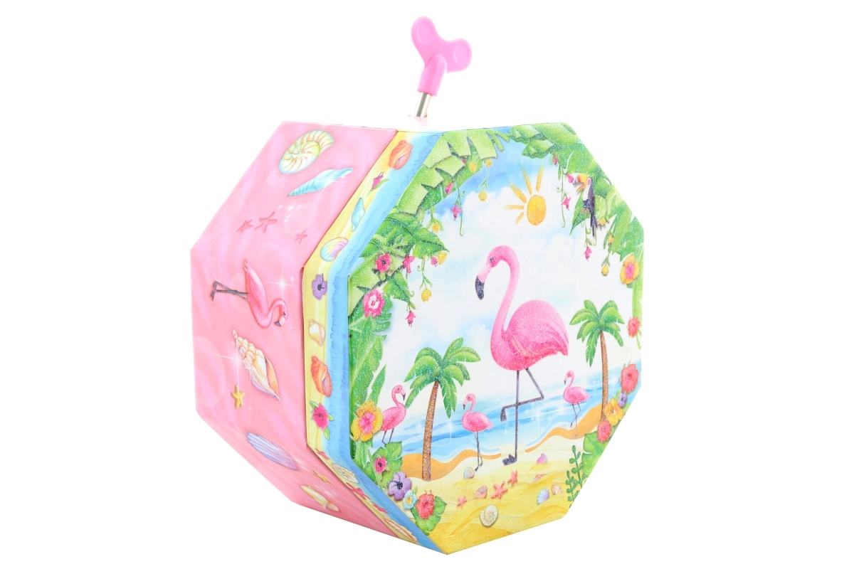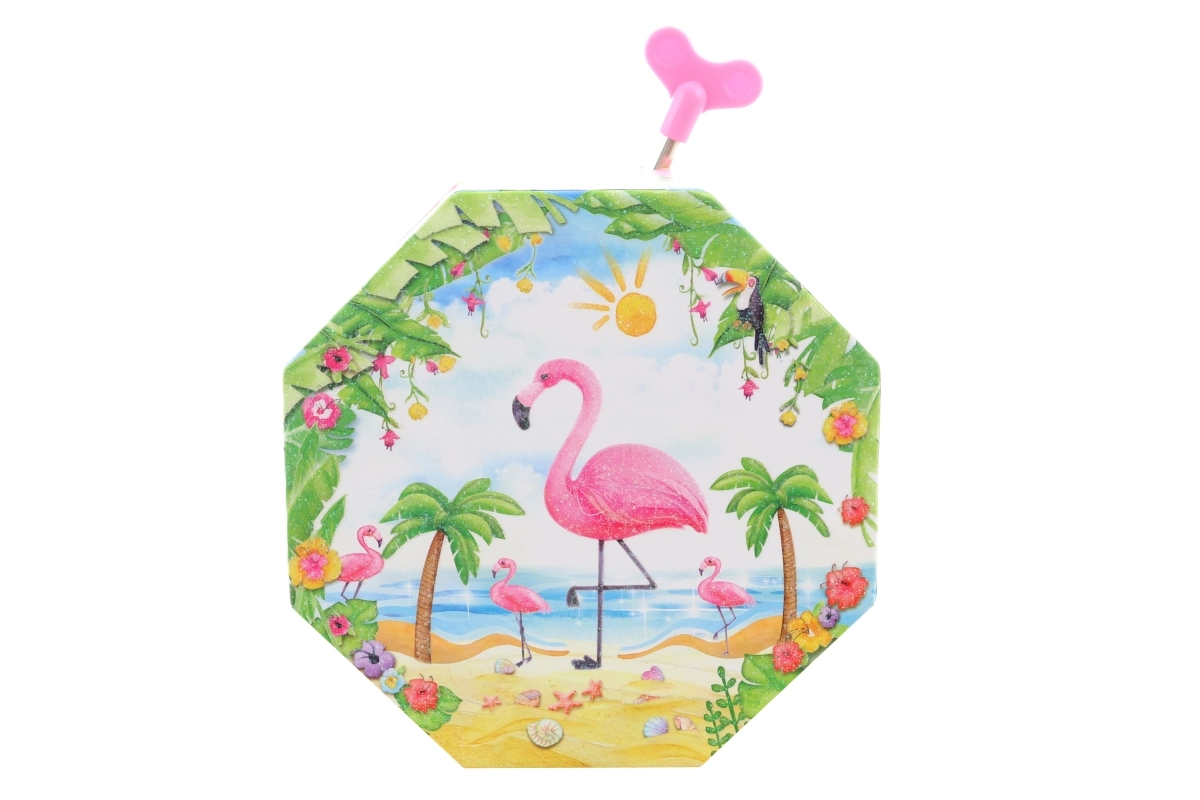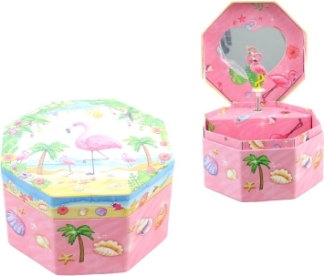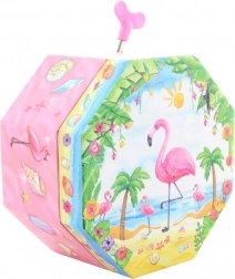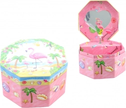 Ta urocza muzyczna szkatułka w różowym wydaniu wyróżnia się ośmiokątnym kształtem i tropikalnym motywem z flamingiem, palmami oraz muszlami. Po otwarciu ukazuje się tańczący flaming przed lusterkiem w kształcie serca, który zaczyna się obracać po nakręceniu kluczyka i towarzyszy odkładaniu biżuterii przyjemną melodią.