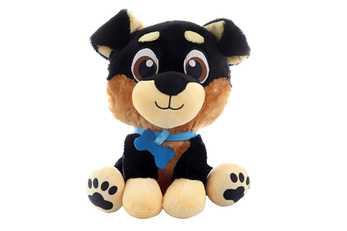 Bezpieczne wykonanie bez drobnych części, wytrzymałe szwy i miękki materiał czynią z niego doskonałego towarzysza dla niemowląt i starszych dzieci. Stylowa niebieska obroża oraz łapki z nadrukiem nadają zabawce wyjątkowy charakter.
