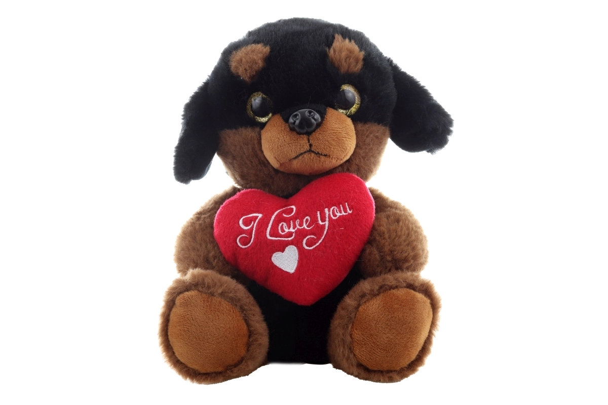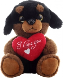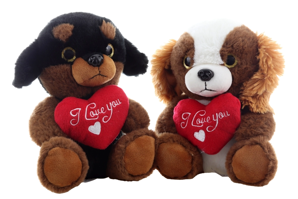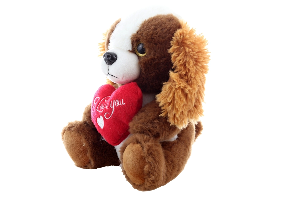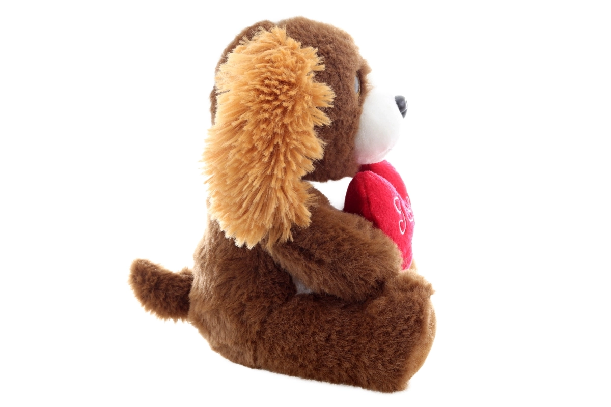 Piesek ma około 21 cm wysokości, ładnie siedzi i w łapkach trzyma czerwone serce z napisem „I love you”. Dostępny w dwóch wariantach kolorystycznych (wysyłka zależnie od dostępności). Odpowiedni już od urodzenia.