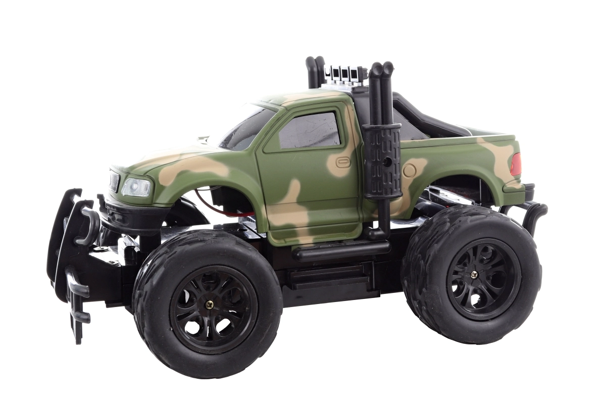 Solidne nadwozie w zielonym moro, podwyższone zawieszenie i duże opony ułatwiają przejazd przez drobne nierówności oraz po dywanie.