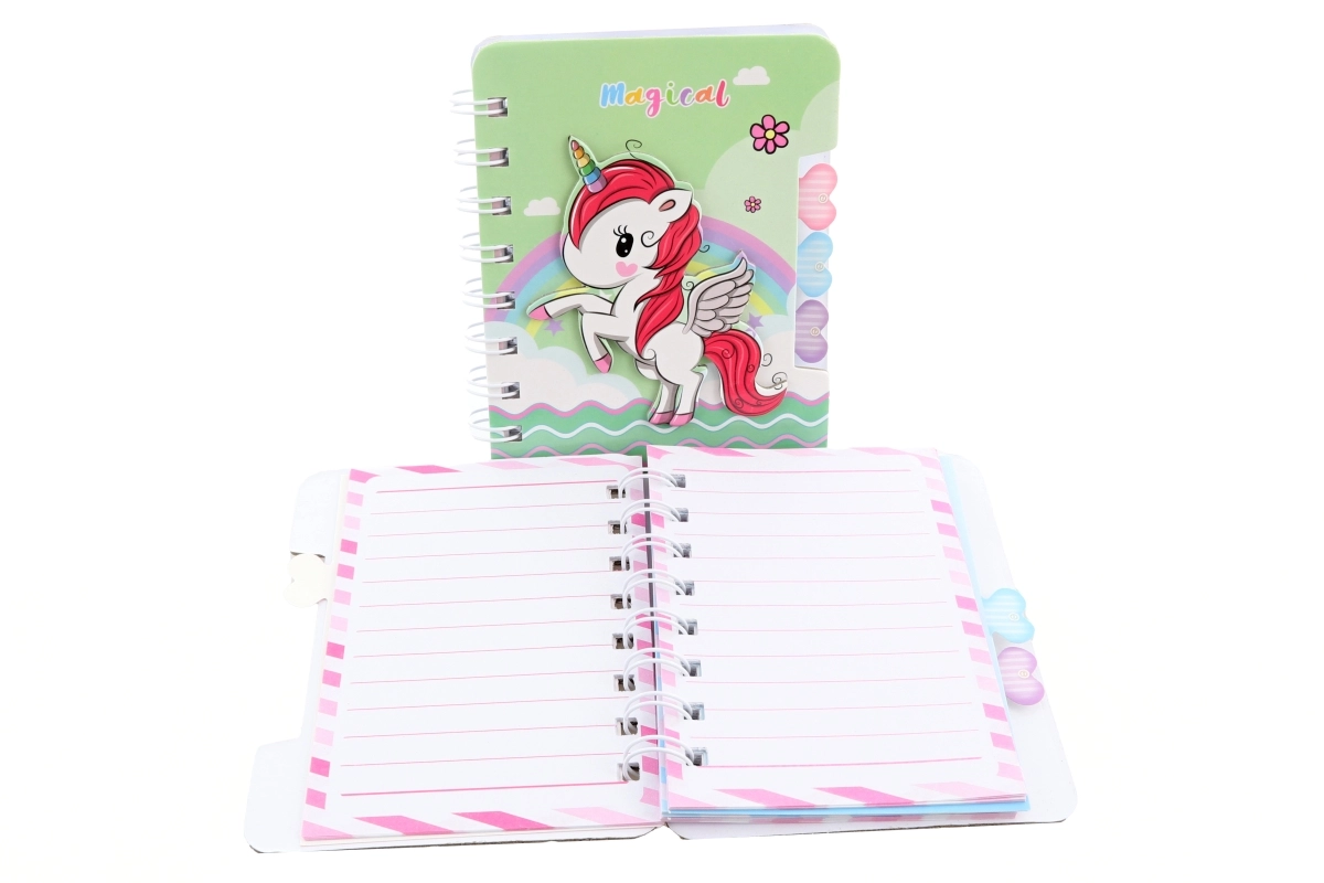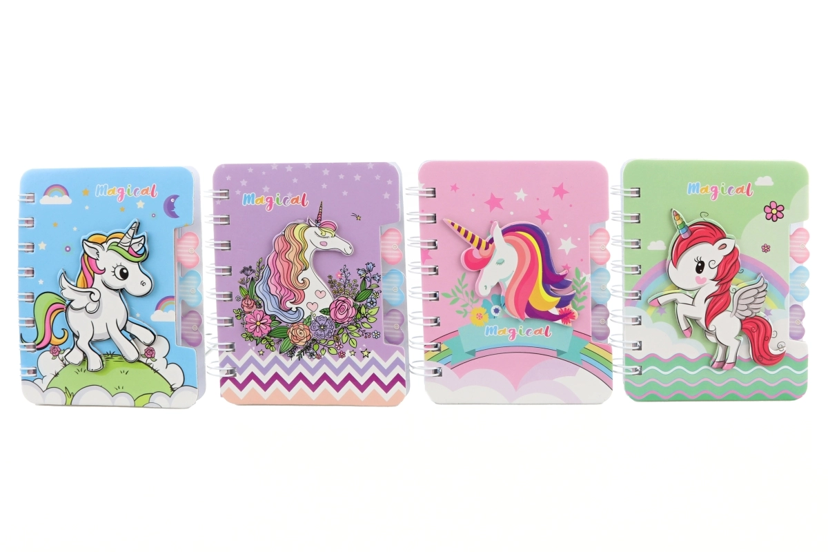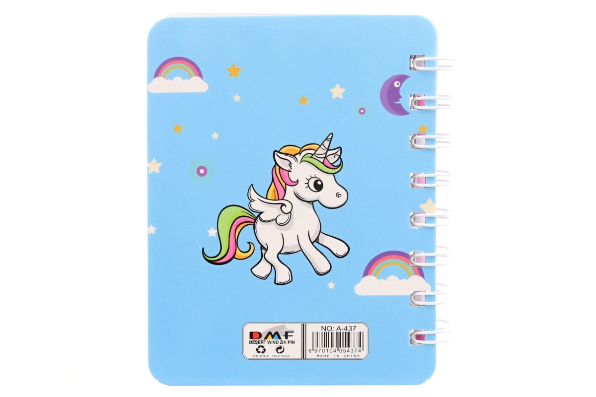 Uroczy mini notes z motywem jednorożca ucieszy dzieci i dorosłych. Dzięki kompaktowym wymiarom mieści się do każdej torby i jest idealny na szybkie notatki lub rysunki. Ma kolorowe, liniowane kartki, spiralną oprawę dla łatwego przekładania stron oraz wiele pastelowych wzorów z jednorożcami. Świetny jako mały prezent lub dodatek do szkoły. Uwaga: produkt nie jest zabawką.