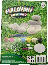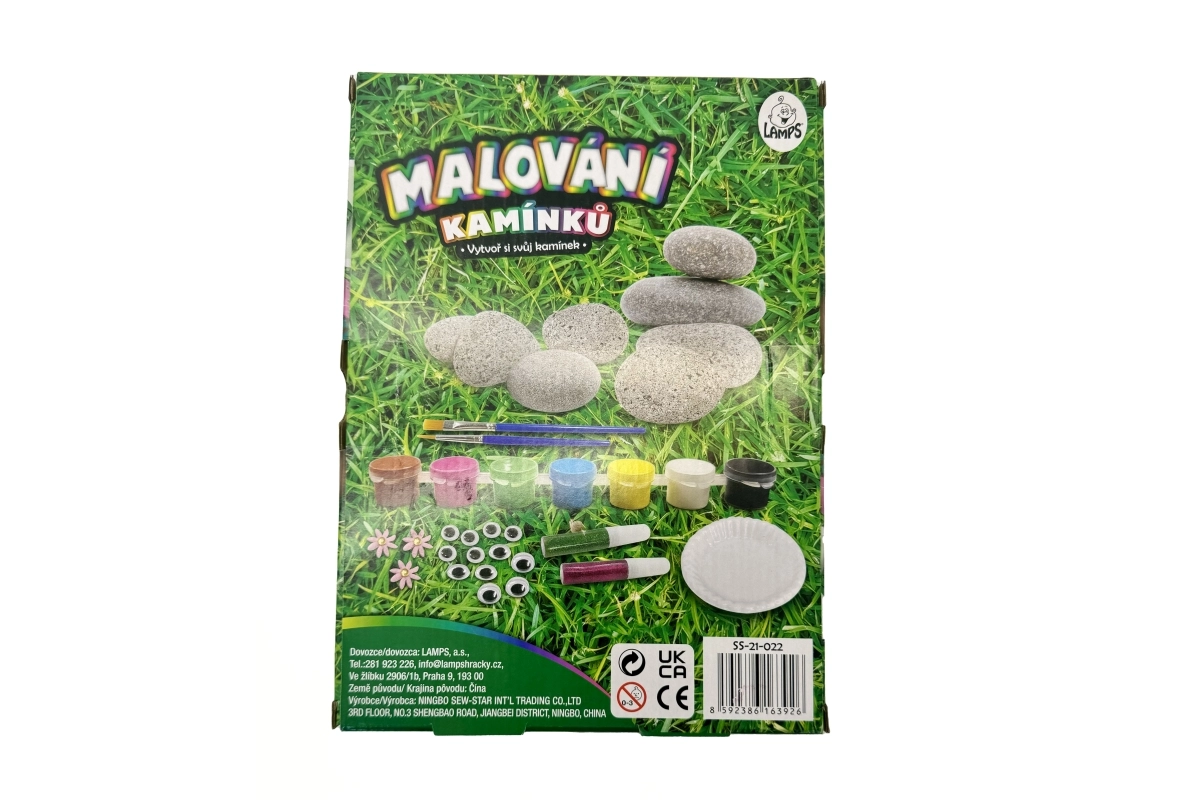 - 8 kamyków, 5 farb, 2 pędzelki, 12 ruchomych oczek, dodatki do ozdabiania