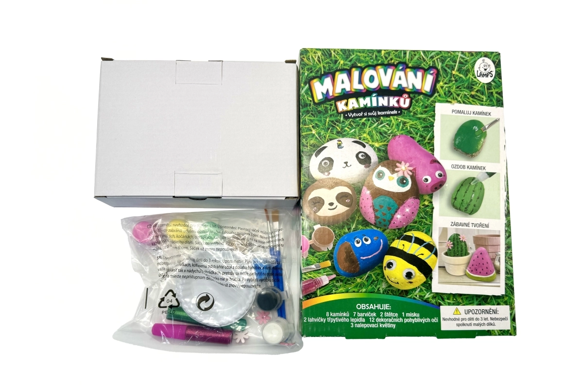 - Kompletne wyposażenie – kamyki, farby, pędzelki i ozdoby w jednym opakowaniu.
