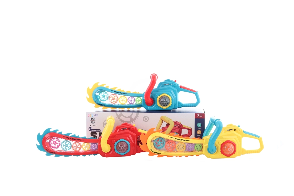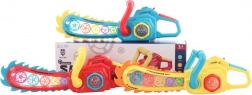 Zabawna dziecięca piła łańcuchowa na baterie ucieszy małych majsterkowiczów realistycznymi efektami. Świeci, wydaje dźwięki, w środku obracają się zębatki i porusza się taśma. Zasilanie: 3× baterie AA (brak w zestawie).