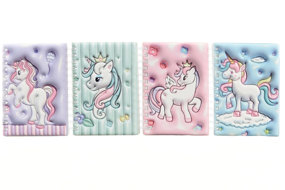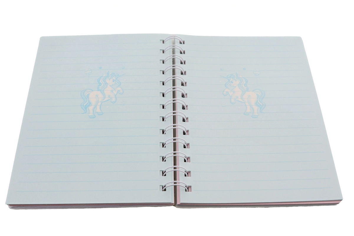 Uroczy notes z motywem jednorożca ucieszy dzieci i dorosłych. Ma spiralną oprawę dla wygodnego przekładania kartek, 80 liniowanych stron w 2 kolorach oraz pikowane, profilowane okładki 3D z efektownym tłoczeniem. Kompaktowy rozmiar 17,6 × 12,5 cm zmieści się do torebki i plecaka.