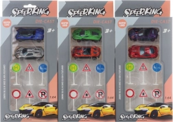 - Zestaw metalowych autek i plastikowe znaki drogowe