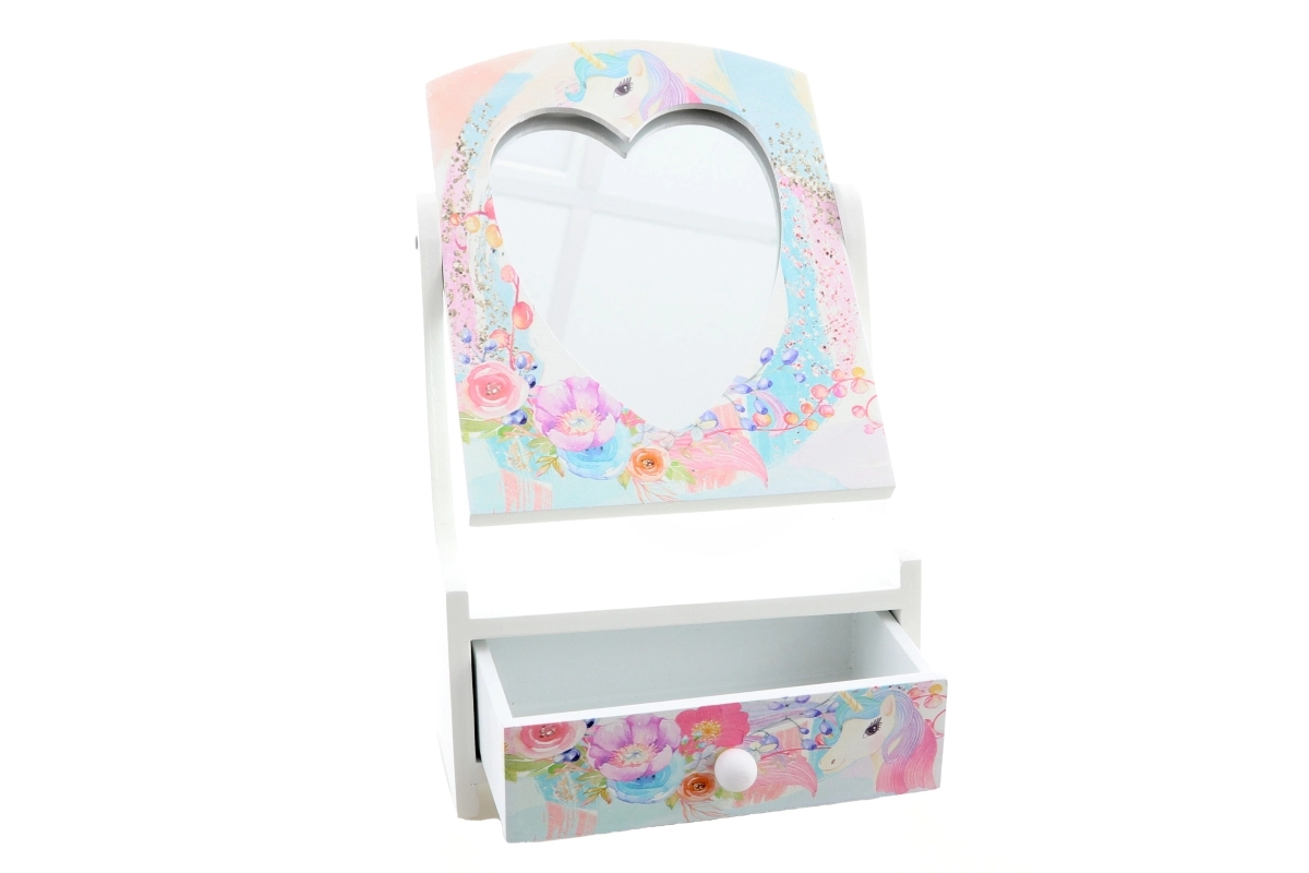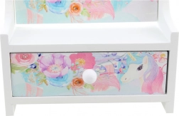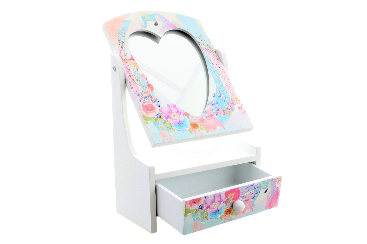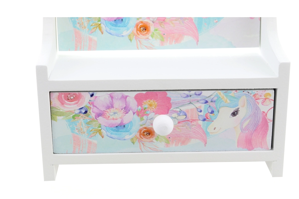 Magiczna dziecięca szkatułka na biżuterię z lusterkiem w kształcie serca i motywem jednorożca idealnie nadaje się do przechowywania drobnych skarbów. Oferuje praktyczną szufladkę, stabilne drewniane wykonanie i bezpieczne użytkowanie od 3 lat.
