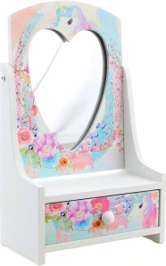 Urocza drewniana szkatułka z odchylanym lusterkiem w kształcie serca pomoże dzieciom trzymać swoje skarby przejrzyście w jednym miejscu. Subtelne pastelowe kwiatowe i jednorożcowe motywy czynią z niej piękną dekorację pokoju dziecięcego oraz praktycznego pomocnika do codziennego czesania i zabawy.