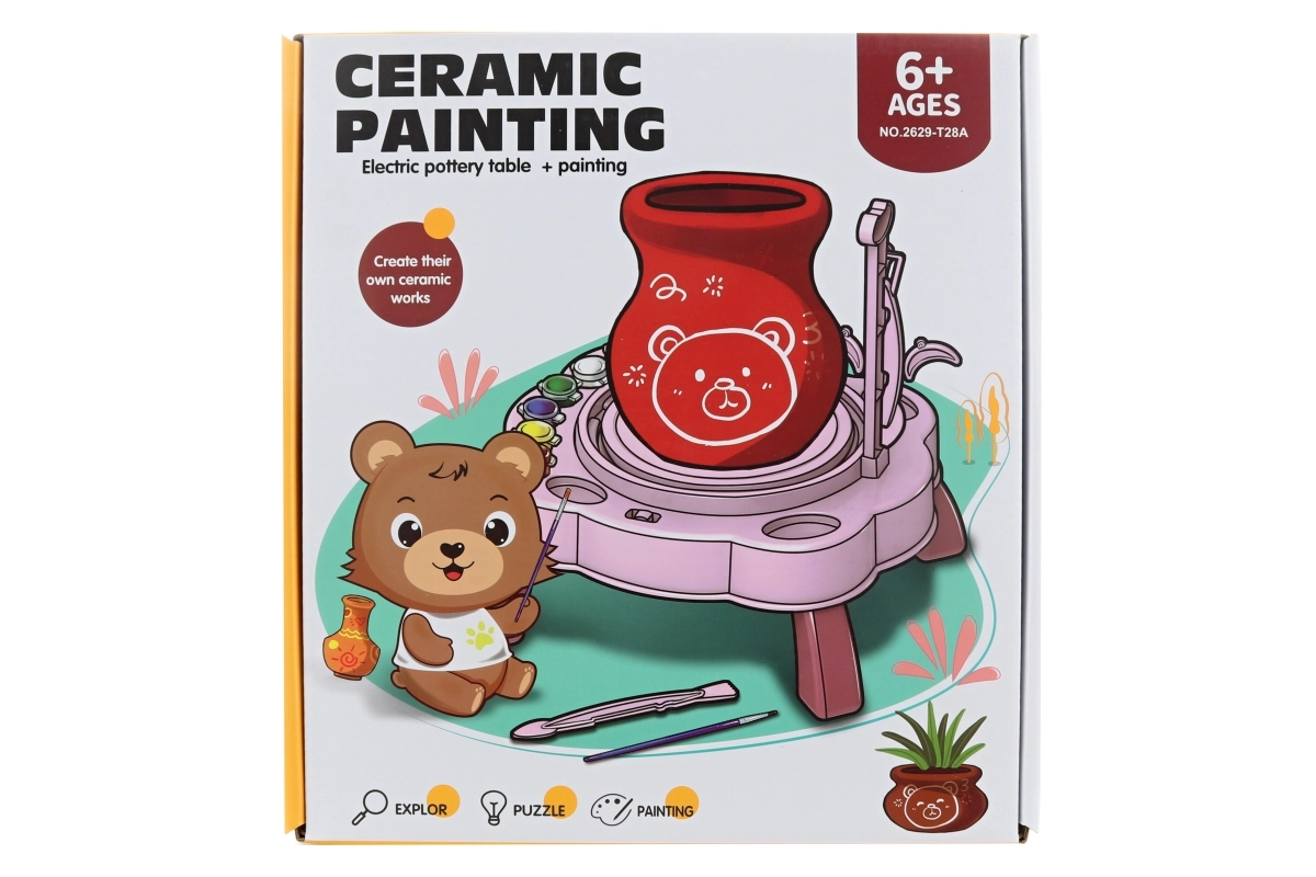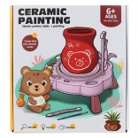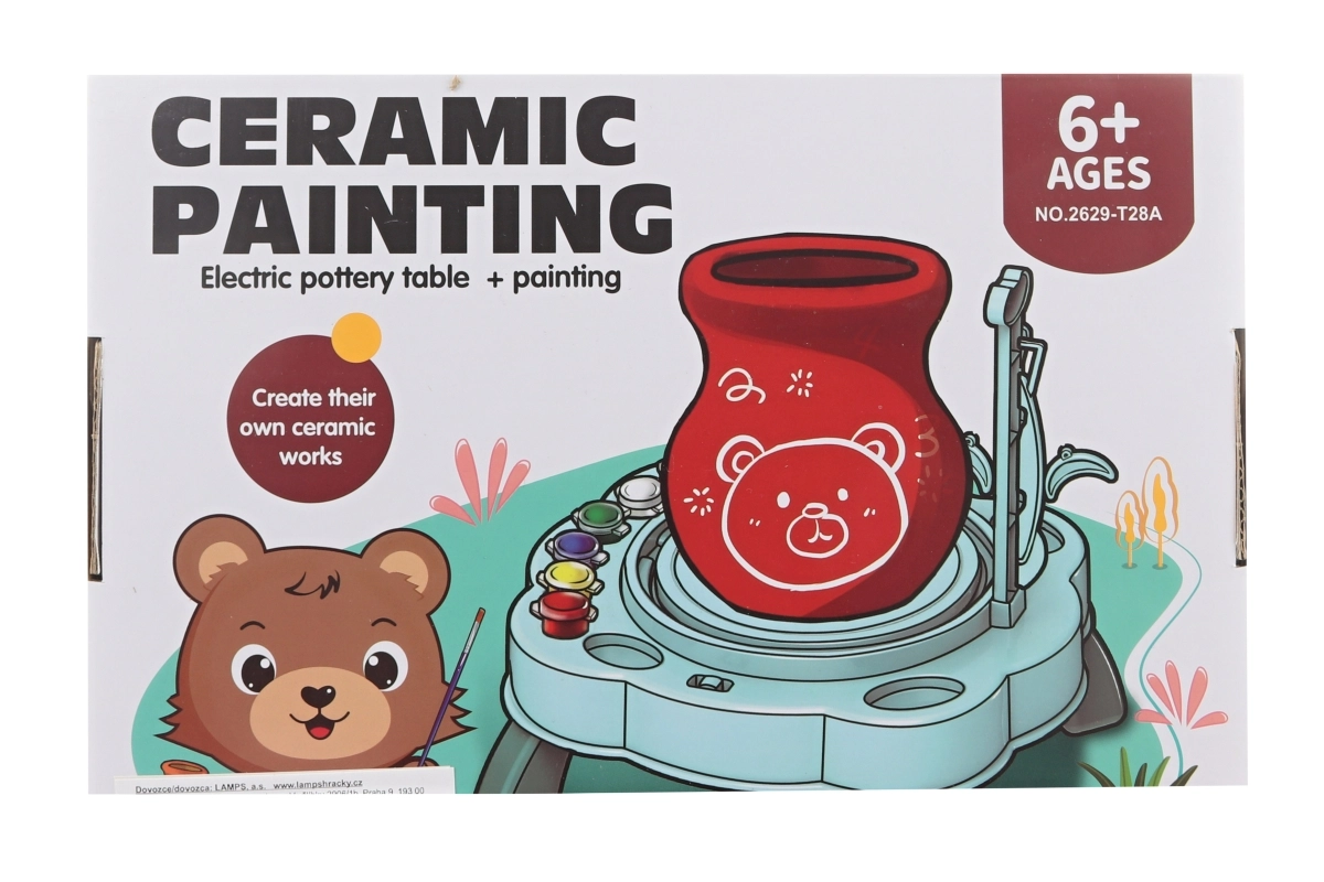 - Kompletny zestaw: 2 woreczki z gliną, 2 pędzle, paletka z farbami, drobne dodatki, instrukcja i koło z nóżkami.