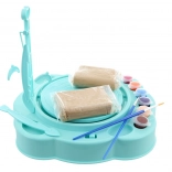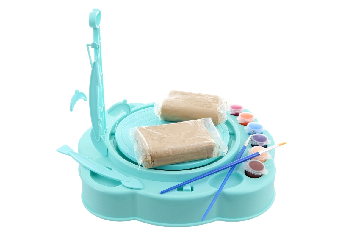 To dziecięce koło garncarskie zapewnia świetną zabawę oraz rozwój motoryki małej i kreatywności. Dzięki zasilaniu bateryjnemu można je łatwo używać wszędzie – wystarczy włożyć glinę, uruchomić koło i zacząć tworzyć własne miseczki, wazoniki lub dekoracje. Turkusowe wykonanie ucieszy małych artystów i zachęci do tworzenia.