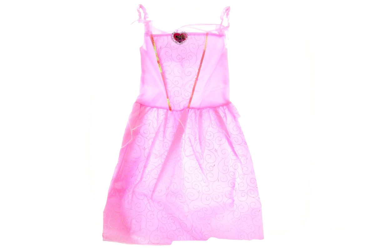 Uroczy kostium dla małych księżniczek z bogatym zestawem dodatków. W zestawie znajdują się sukienka z błyszczącymi detalami, korona, czarodziejska różdżka, torebka oraz biżuteria do perfekcyjnych przebieranek. Idealny na zabawy w przebieranie, karnawał i dziecięce przyjęcia.
