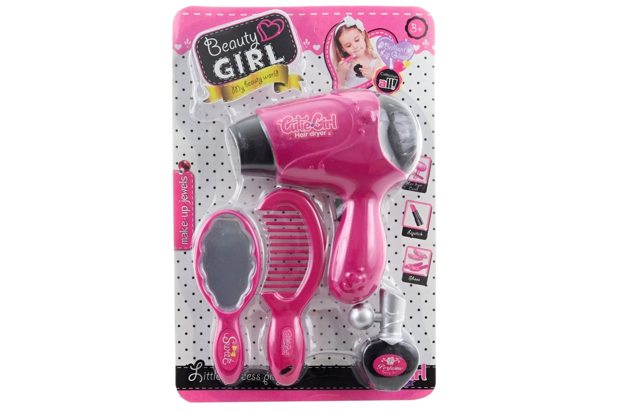 Ten dziecięcy zestaw fryzjerski ucieszy wszystkie małe stylistki. Lekka suszarka na baterie jest bezpieczna dla dziecięcych rąk, a wraz z lusterkiem, grzebykiem i buteleczką na „perfumy” tworzy idealne wyposażenie do zabawy w salon fryzjerski. Dzięki kompaktowym wymiarom zestaw łatwo przenosić i przechowywać.