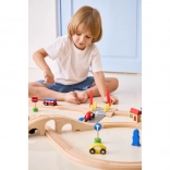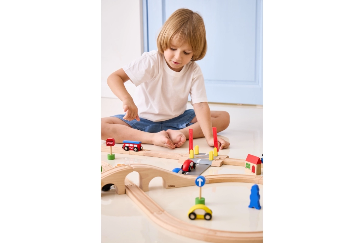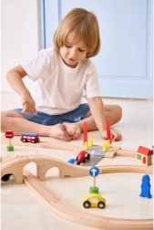 Mastywna drewniana konstrukcja i solidne elementy wytrzymują codzienną zabawę. Idealny dodatek do zestawów z pociągami, autkami i znakami drogowymi.