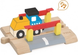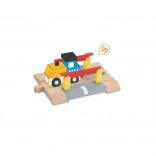 Solidna drewniana konstrukcja zapewnia długą żywotność i bezpieczną zabawę. Kompatybilne zakończenia umożliwiają łatwe połączenie z popularnymi drewnianymi systemami torów i dróg. Zasilanie na 2 baterie guzikowe dodaje atrakcyjnych efektów, które wspierają wyobraźnię i koncentrację.