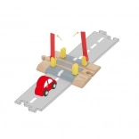 Obie czerwone rogatki można łatwo podnosić i opuszczać – dzieci ćwiczą małą motorykę i uczą się zatrzymywać auta oraz pociąg we właściwym momencie.