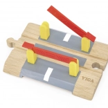 Końcówki łączące pasują do popularnych drewnianych systemów torów i dróg, więc przejazd łatwo włączysz do istniejącej zabudowy.
