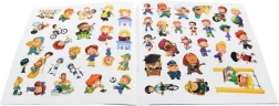 Dwa arkusze kolorowych naklejek z wesołymi motywami rozwijają wyobraźnię i umożliwiają dokończenie obrazków lub ozdobienie zeszytów i pamiętników.