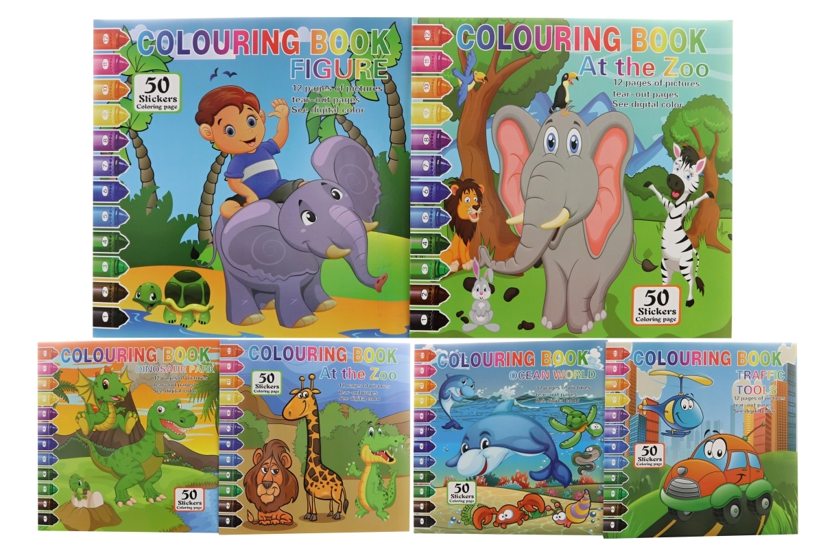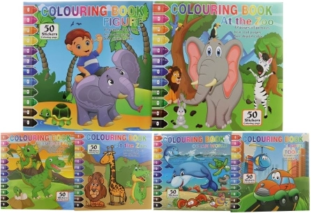 5 dwustronnych arkuszy z kolorowankami, 2 arkusze naklejek