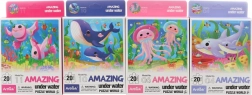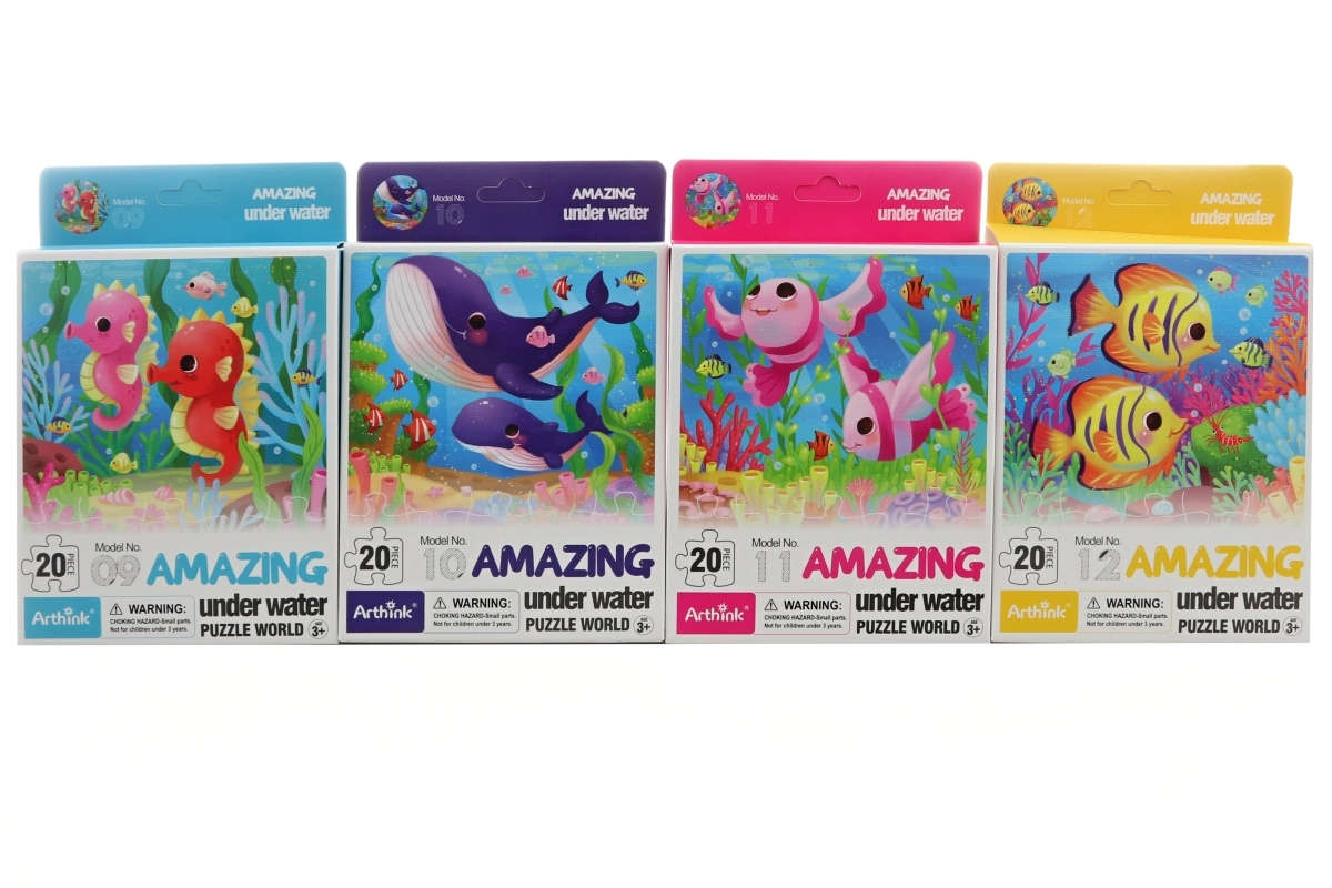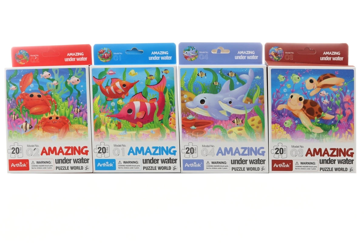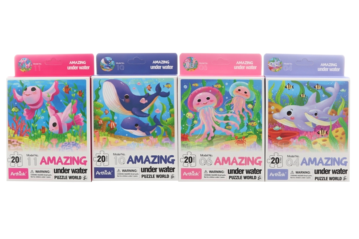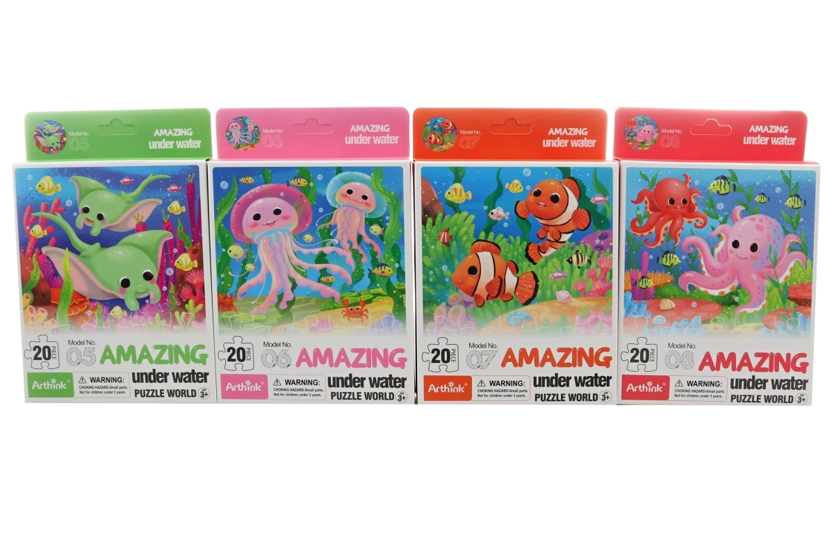 Po ułożeniu puzzle mają kompaktowe wymiary 21 × 19 cm, więc łatwo je przechowywać i przenosić. Z 12 dostępnych wzorów wysyłamy wariant zgodnie z aktualną dostępnością magazynową, każdy przedstawia atrakcyjne sceny z podwodnego życia.