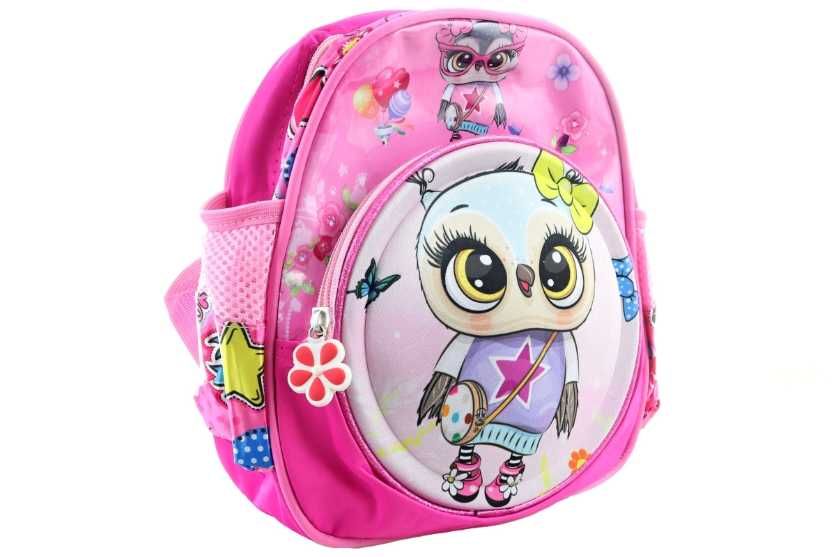 Ten lekki i praktyczny plecak w różowym kolorze z dużą sówką jest idealny na drobiazgi w podróży i do przedszkola. Główna komora pomieści przekąskę, zabawkę i pelerynę przeciwdeszczową, a przednia okrągła kieszeń świetnie nadaje się na klucze lub chusteczki. Profilowany front i wysokiej jakości zamki z dekoracyjnymi suwakami dodają plecakowi stylu i wytrzymałości.