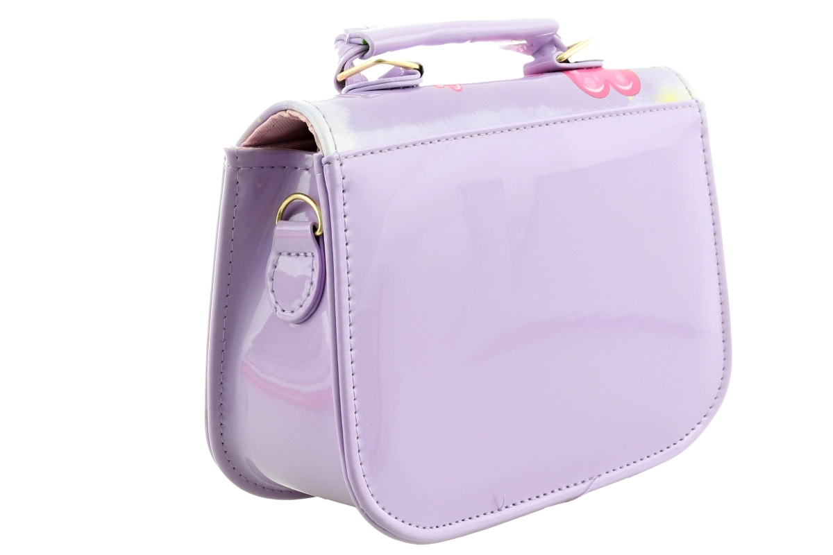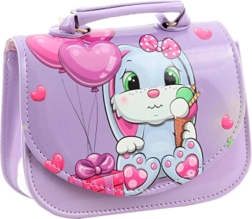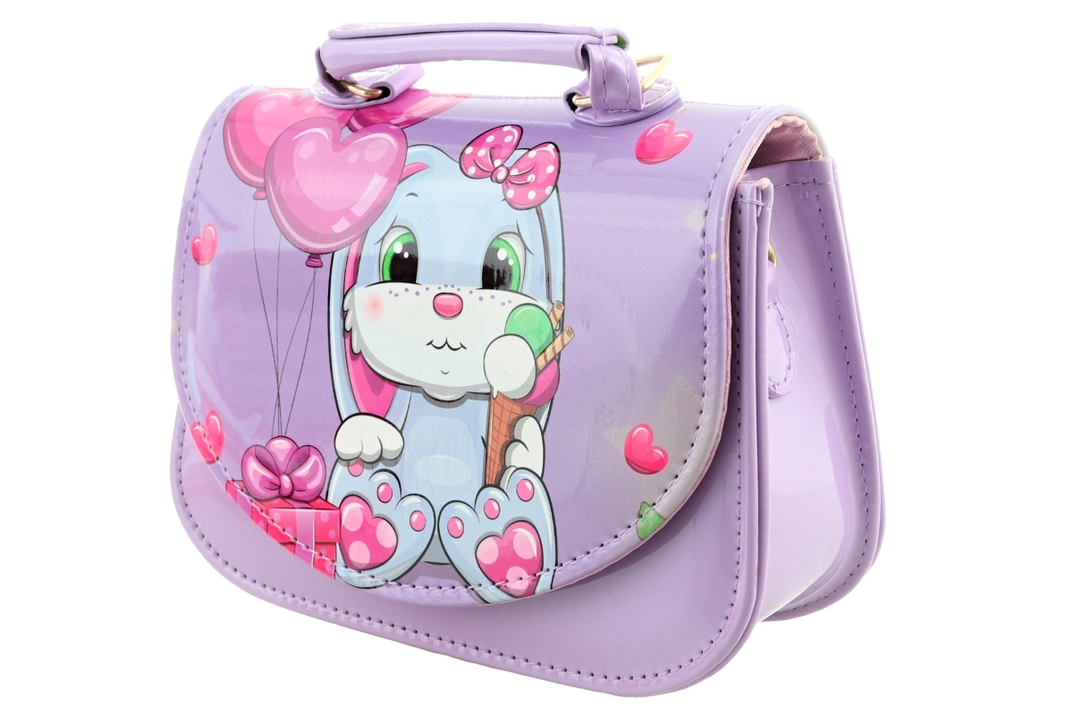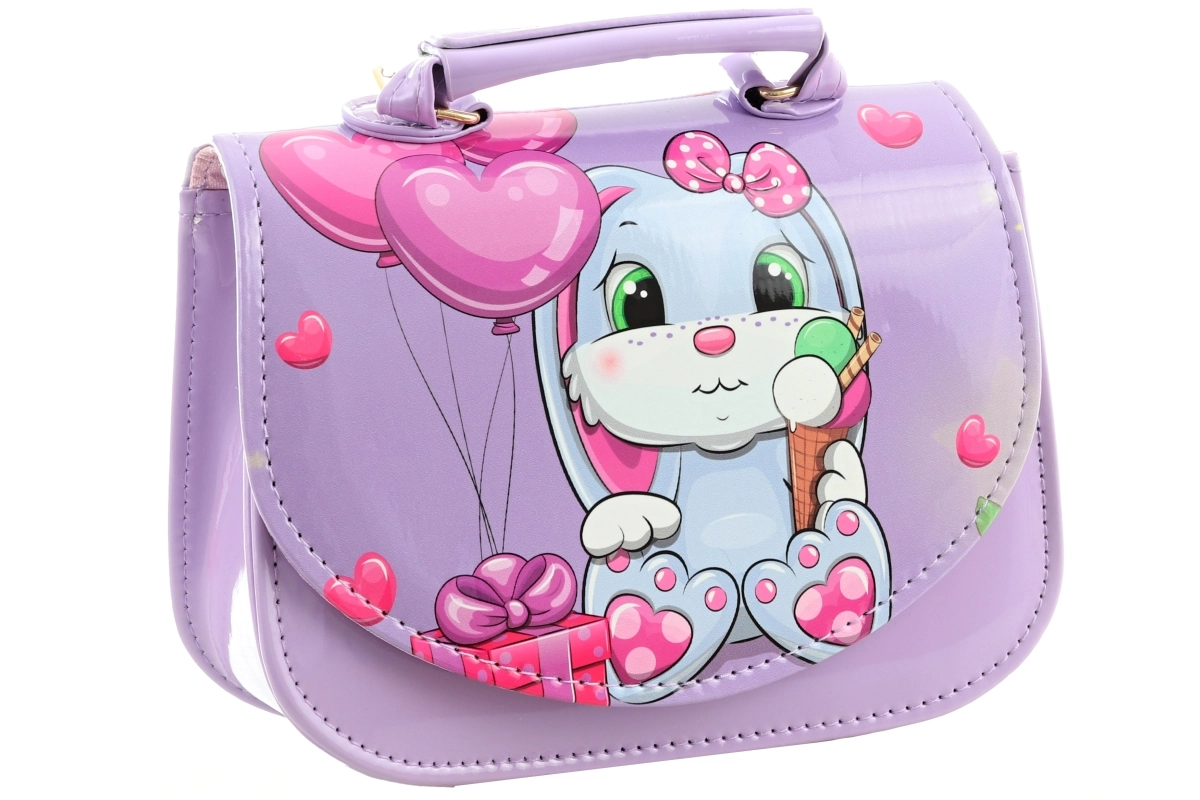 Ta mała fioletowa torebka z uroczym króliczkiem, balonikami i serduszkami zachwyca od pierwszego spojrzenia. Błyszczący materiał, precyzyjne przeszycia i solidna konstrukcja sprawiają, że torebka dobrze trzyma kształt i jest odporna na codzienne użytkowanie. Jedna przejrzysta kieszeń i łatwe zapięcie na nap ułatwiają codzienne korzystanie.