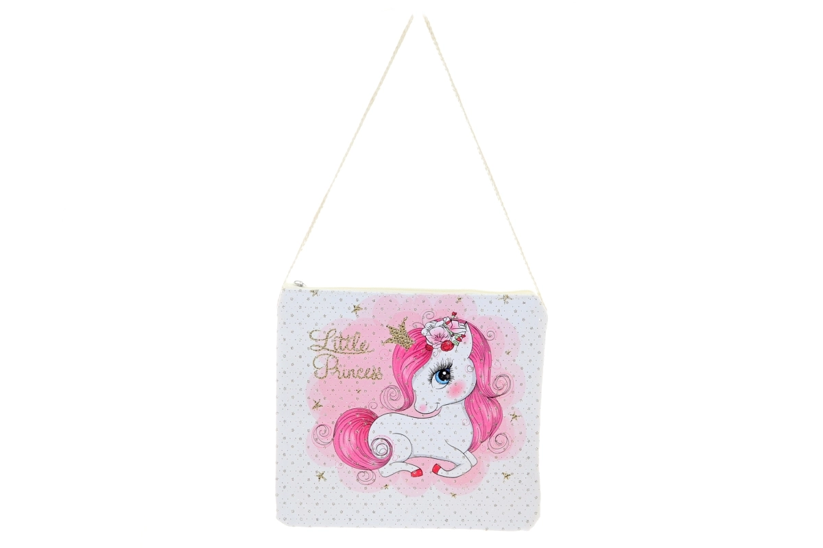 Urocza materiałowa torebka z motywem jednorożca zachwyci miłośników fantasy i słodkich dodatków. Przednia strona z połyskującej ekoskóry zapewnia stylowy blask i łatwą pielęgnację. Kompaktowe wymiary 24 × 22 cm oraz regulowany pasek o długości ok. 2 × 60 cm sprawiają, że to idealny modny dodatek. Produkt nie jest zabawką, przeznaczony jest do celów dekoracyjnych.