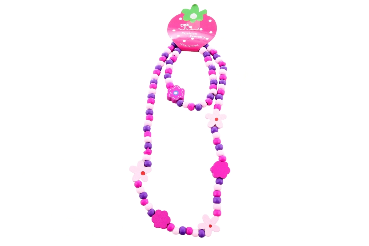 Ten delikatny zestaw zawiera naszyjnik i bransoletkę wykonane z wysokiej jakości drewnianych koralików w żywych kolorach z kwiatowym motywem. Elastyczna gumka zapewnia łatwe zakładanie i komfort noszenia bez zapięcia. Świetnie uzupełni dziecięce stylizacje i wzbudzi radość z ubierania.