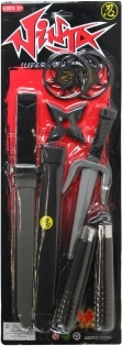 Zawartość opakowania: samurajski miecz z pochwą o długości ok. 36 cm, sztylet, nunchaku i 3 shurikeny (gwiazdki). Świetny wybór na karnawał, przebrania lub domowe opowieści akcji.