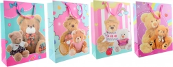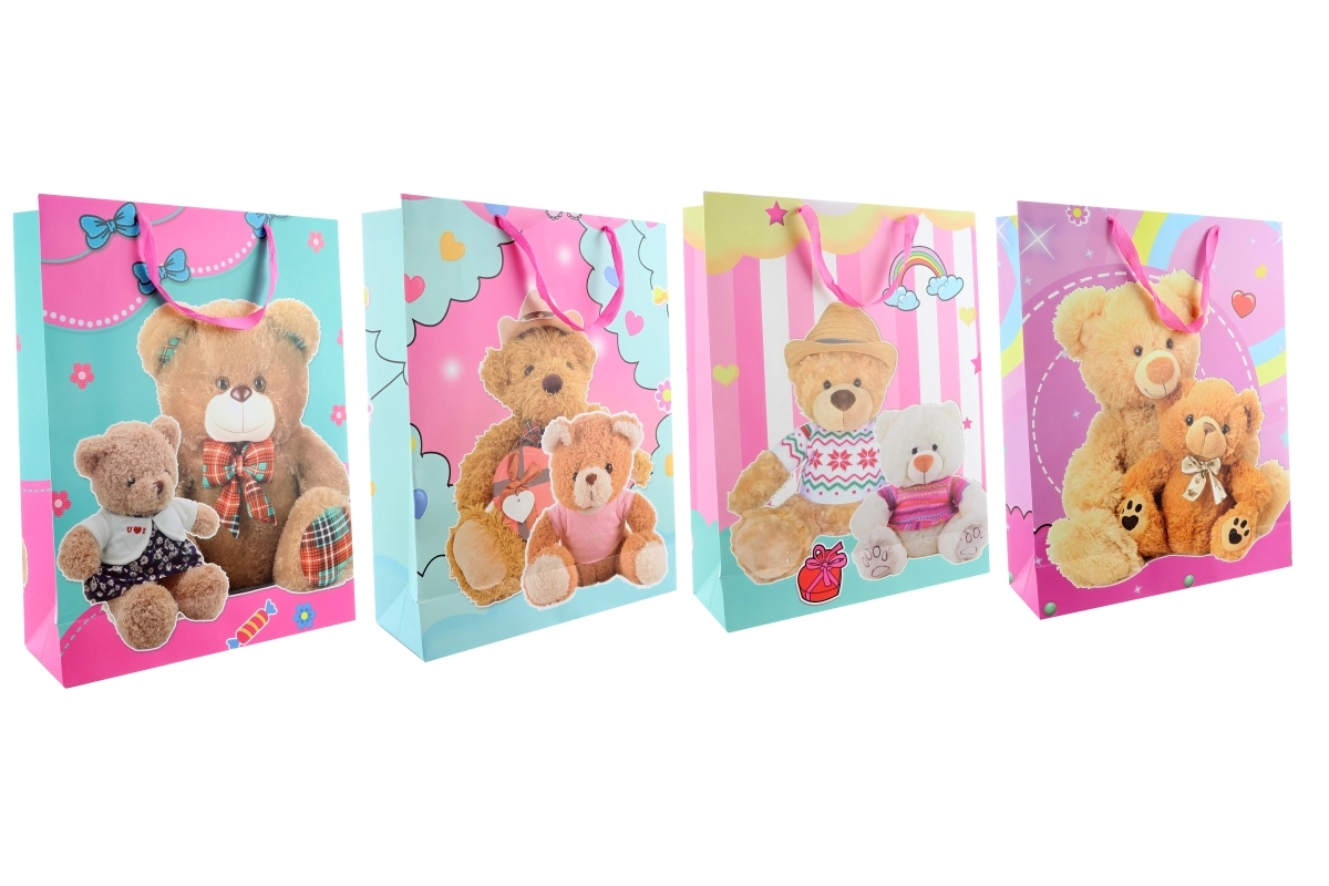 Ta ogromna torebka prezentowa z misiami to świetny wybór do pakowania bardziej obszernych upominków. Wysokiej jakości papier zapewnia wytrzymałość i niezawodność, a uroczy motyw nadaje prezentowi czarujący wygląd.