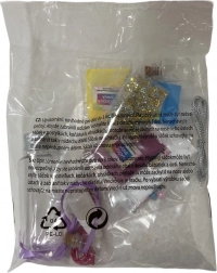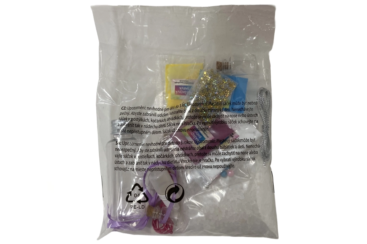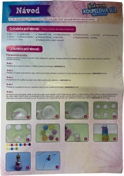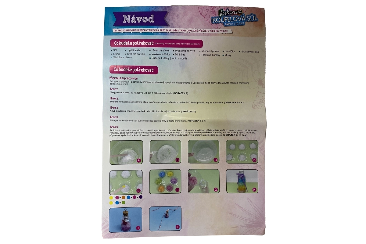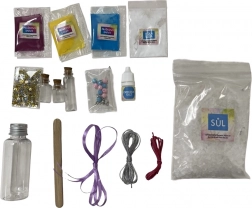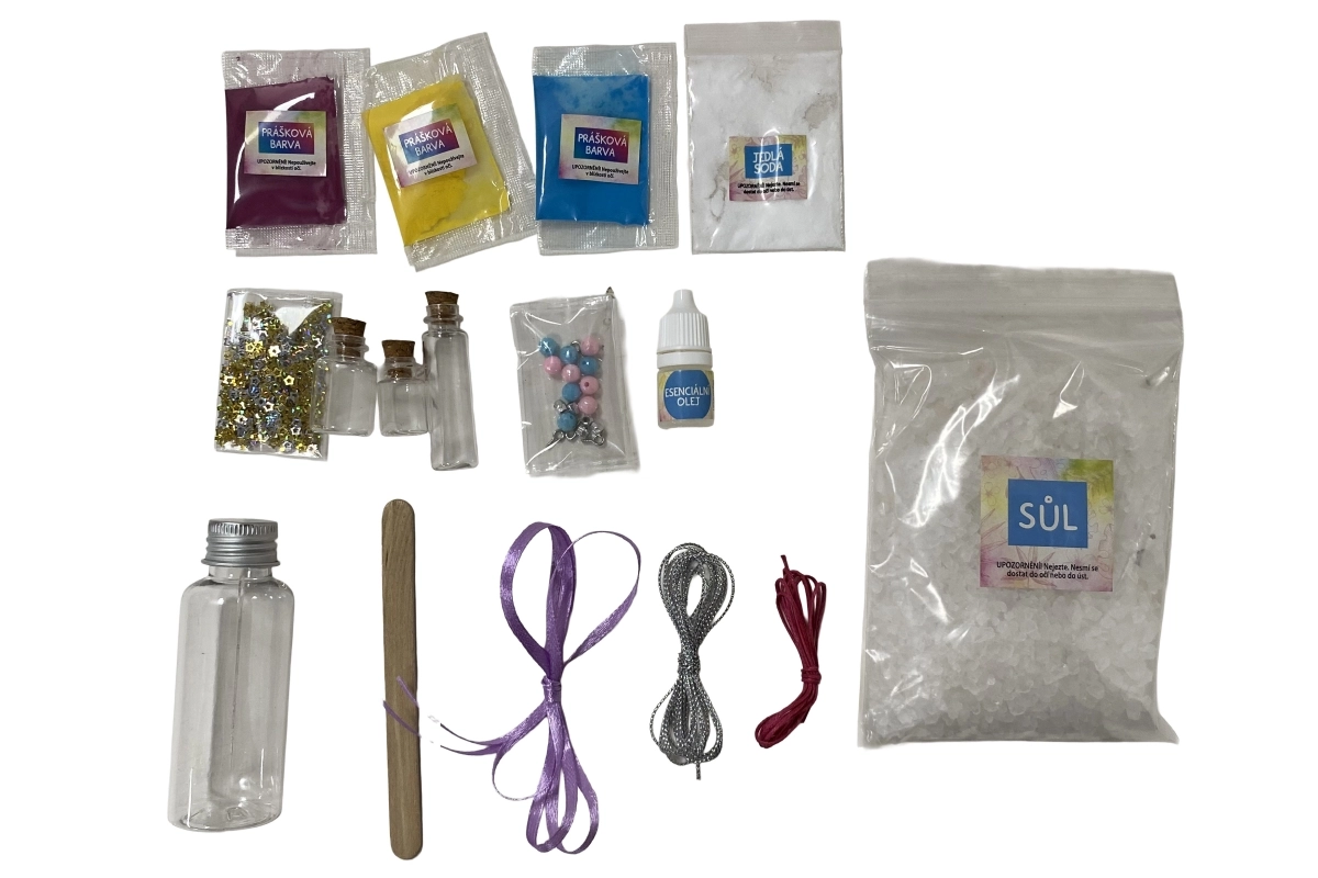 - sól, soda oczyszczona, olejek eteryczny, buteleczki, barwne proszki, patyczki do mieszania, kółeczka z gwintem, srebrny sznureczek, wstążka, woskowany sznurek, mini filtry, plastikowe koraliki, instrukcja